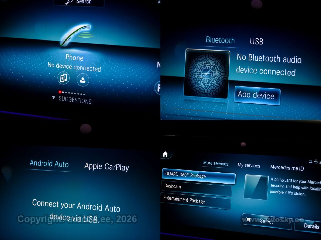 Burmester stereo (originaal), helivõimendi, kõlarid, subwoofer, Apple CarPlay, Android Auto, ekraan (ees), navigatsiooniseade (kaardiga, hääljuhtimisega), autokompuuter, käed vabad süsteem