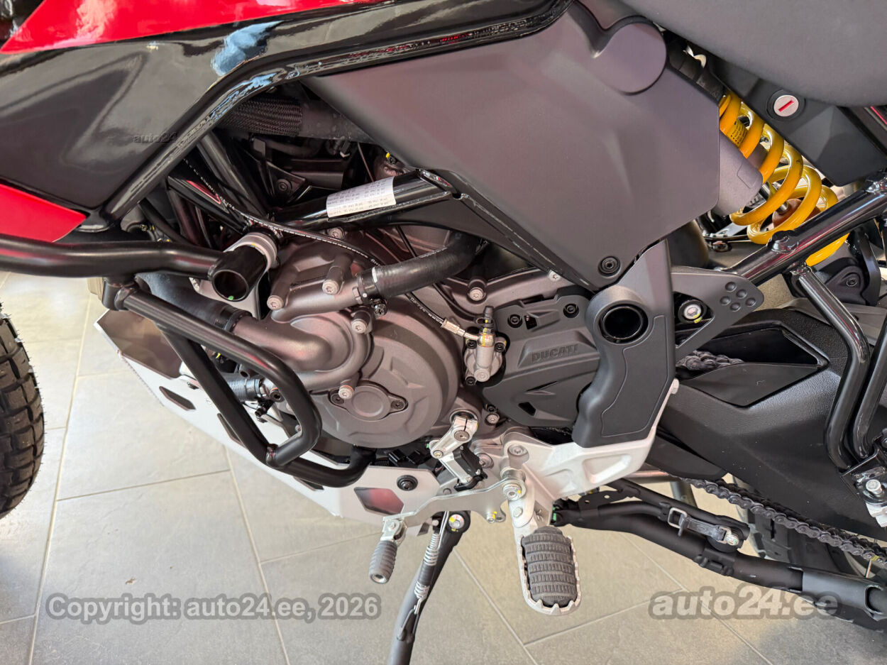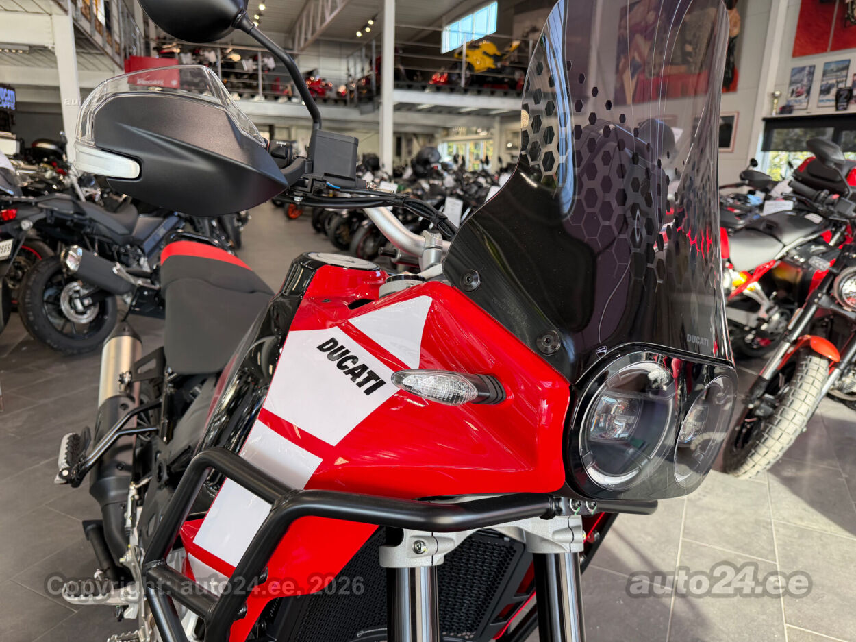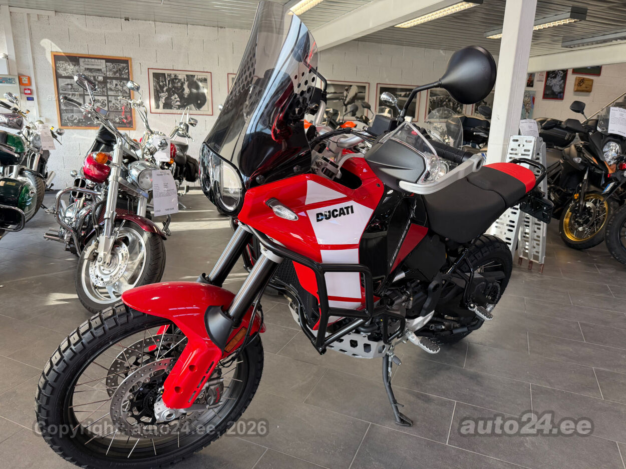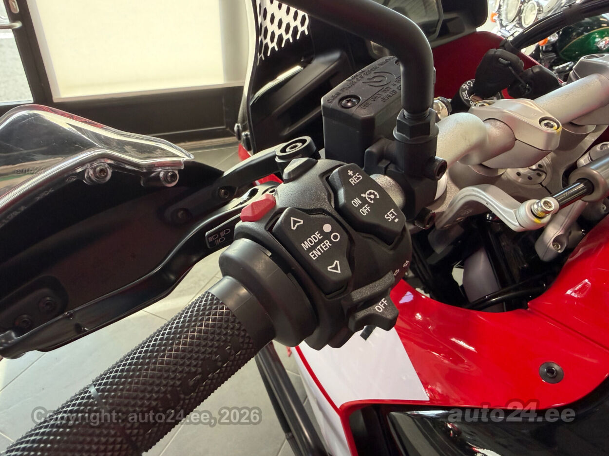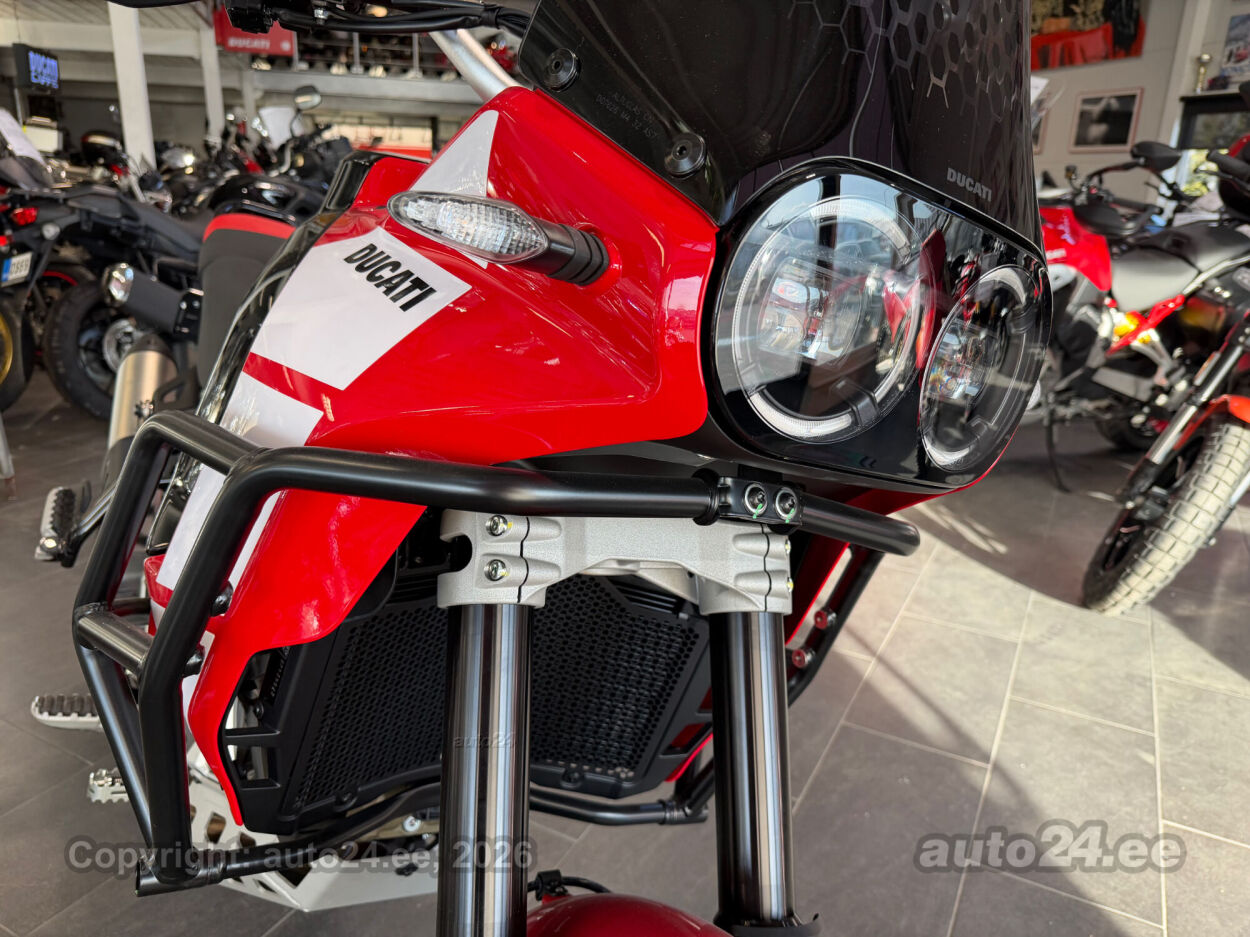 Discovery lisavarustus võrreldes tavamudeliga:, Käepidemesoojendused, Paksust alumiiniumist põhjakaitse, Keskhark, Kõrgem tuuleklaas, Kaitserauad, Lisaks korralik standardvarustuse pakett, mis sisaldab:, Seadistatavad sõidurezhiimid Rally, Enduro, Touring, Sport, Urban, Wet, Enduro, Kõikidel sõidurezhiimidel erinevad mootori võimsuse, mootori pidurdusjõu, wheelie, veojõukontrolli, ABS, QS seadistuse võimalused, Tagaratta ABS väljalülitatav, Elekrooniline gaas RbW, Ducati Safety Pack sis. Bosch kurvi-ABS ja veojõukontroll DTC, Ducati Wheelie Control DWC, Ducati QuickShifter DQS üles/alla, LED tuled, Püsikiirusehoidja, Automaatne suunatulede väljalülitus, Rooliamort, Ducati Brake Light äkkpidurduse hoiatus (DBL), USB voolupesa, Esiratas 21", rehvimõõt 90/90 R21, Tagaratas 18", rehvimõõt 150/70 R18, Ducati multimeediasüsteem DMS valmidus, Alarmivalmidus, "Turn by turn" navigatsioonisüsteemi valmidus, Tehasegarantii 4 aastat!!! |