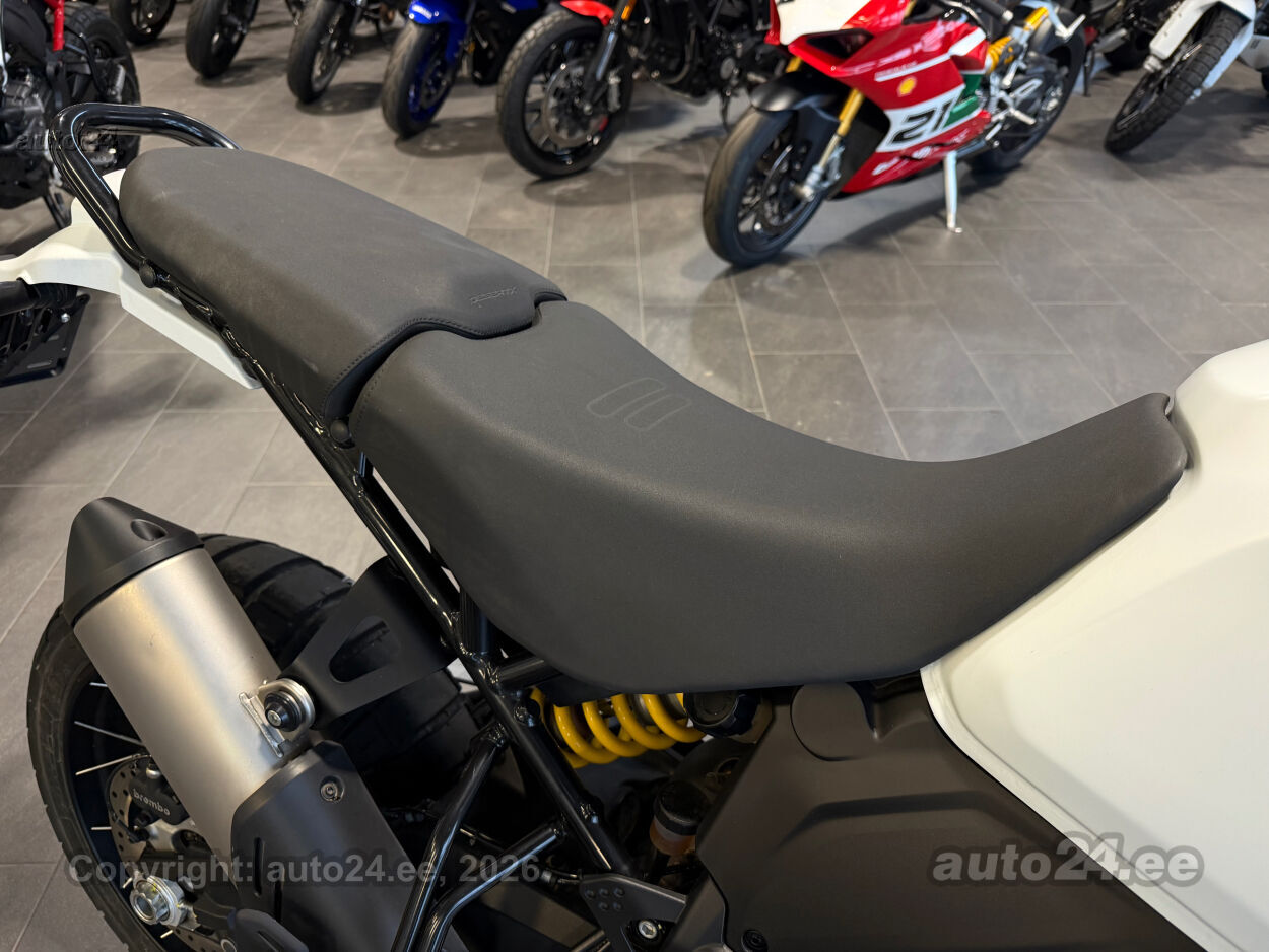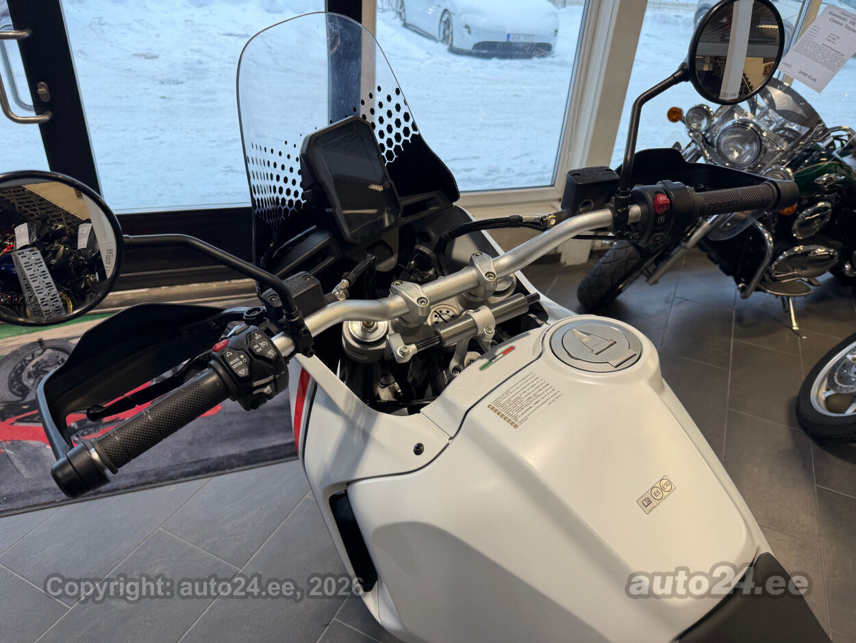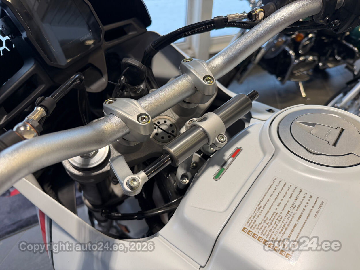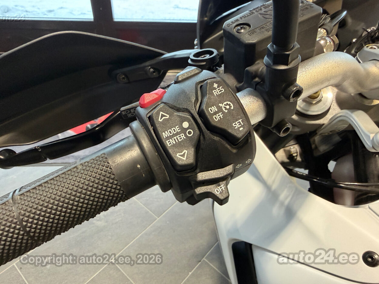 Korraliku standardvarustuse paketiga, mis sisaldab:, Seadistatavad sõidurezhiimid Rally, Enduro, Touring, Sport, Urban, Wet, Enduro, Kõikidel sõidurezhiimidel erinevad mootori võimsuse, mootori pidurdusjõu, wheelie, veojõukontrolli, ABS, QS seadistuse võimalused, Tagaratta ABS väljalülitatav, Elekrooniline gaas RbW, Ducati Safety Pack sis. Bosch kurvi-ABS ja veojõukontroll DTC, Ducati Wheelie Control DWC, Ducati QuickShifter DQS üles/alla, LED tuled, Püsikiirusehoidja, Automaatne suunatulede väljalülitus, Rooliamort, Ducati Brake Light äkkpidurduse hoiatus (DBL), USB voolupesa, Esiratas 21", rehvimõõt 90/90 R21, Tagaratas 18", rehvimõõt 150/70 R18, Ducati multimeediasüsteem DMS valmidus, Alarmivalmidus, "Turn by turn" navigatsioonisüsteemi valmidus, Värskelt hooldatud, kehtiv tehasegarantii!!!! |