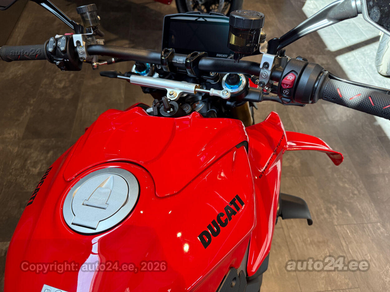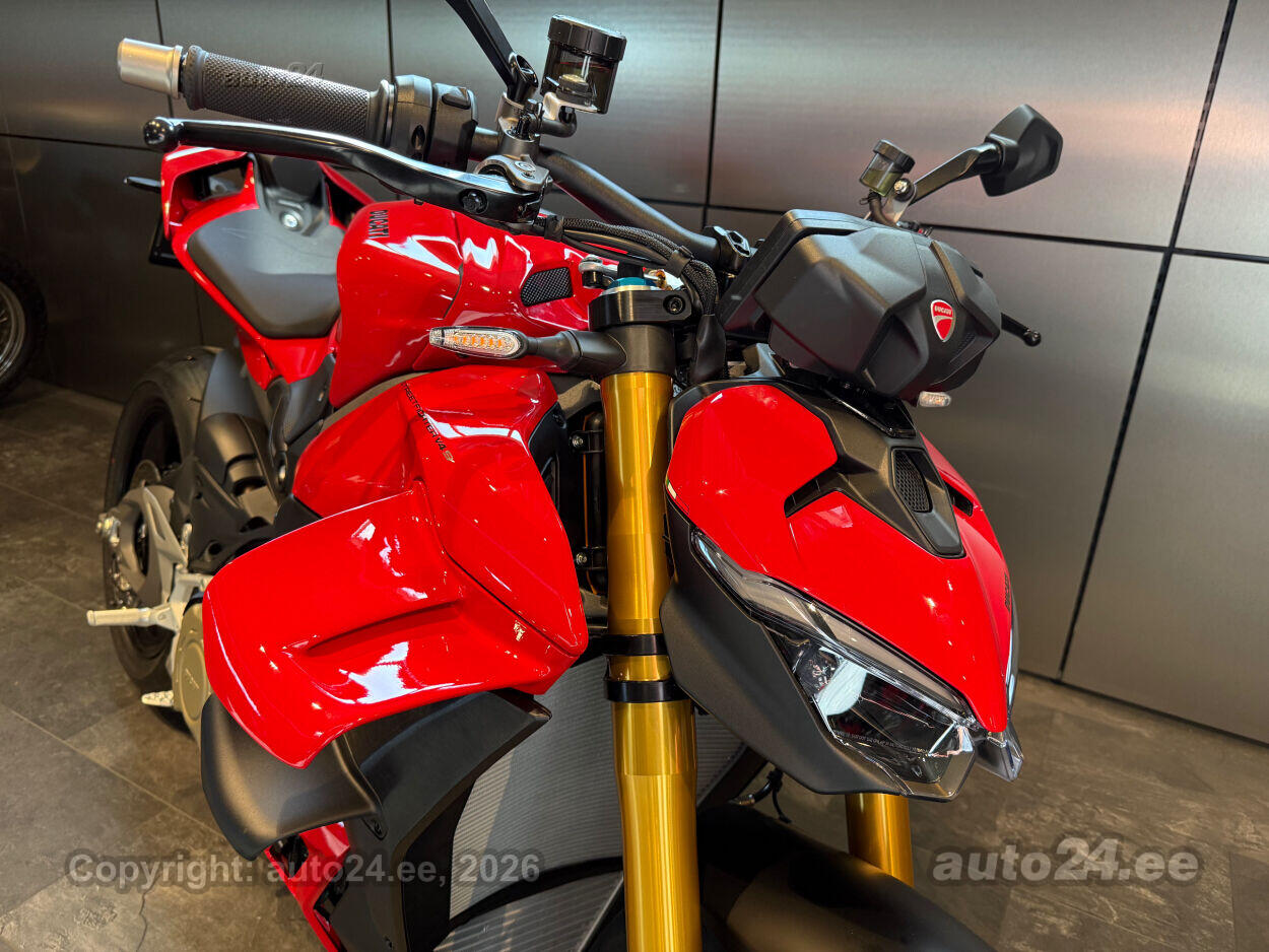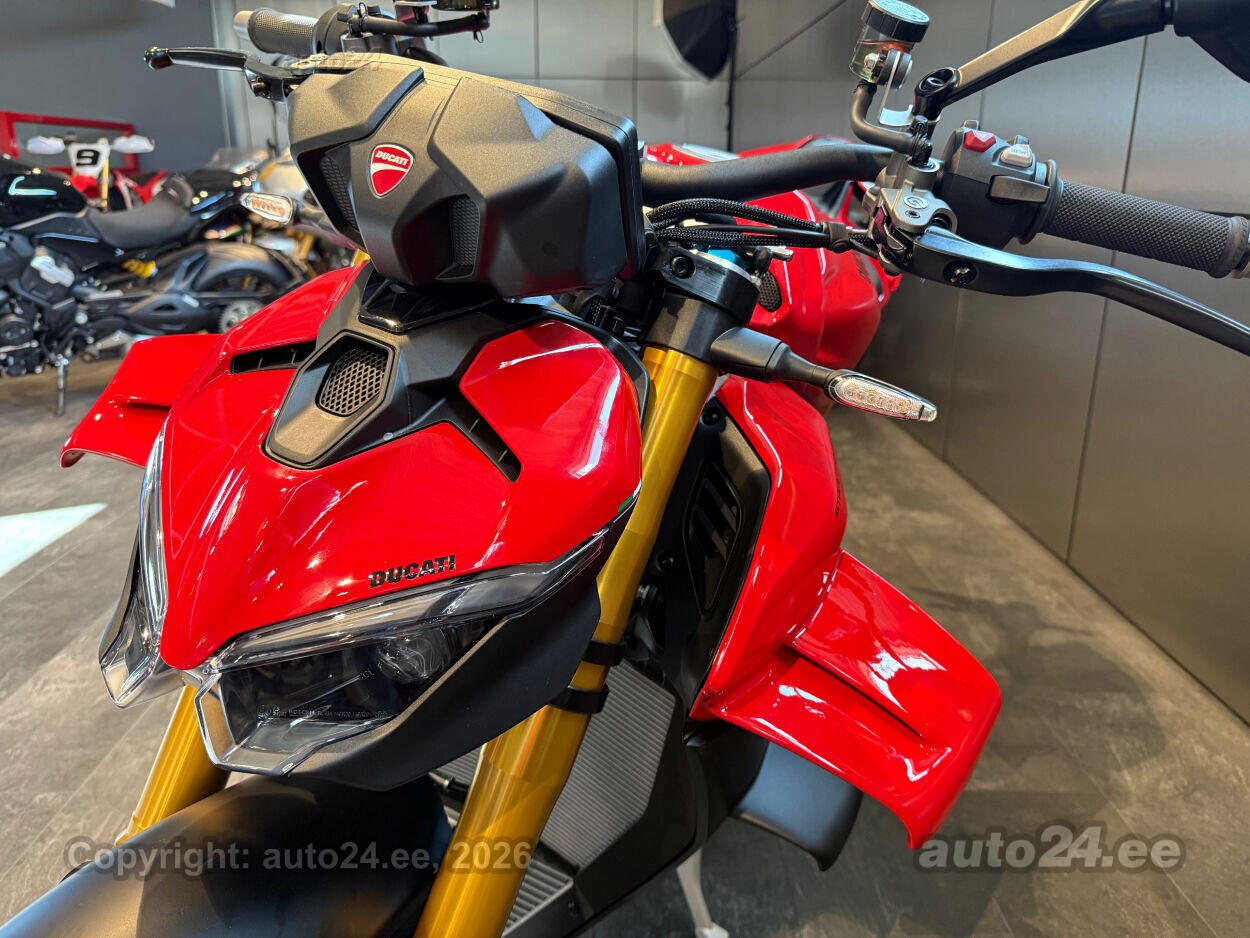 Ducati Streetfighter V4S on tippklassi "naked bike," mis pakub sõiduelamust, mida sa ei unusta. Selle 214 hj Desmosedici Stradale V4 mootor toob igale sõidule plahvatusliku kiiruse ja nauditava adrenaliini. MotoGP-st inspireeritud wingletid tagavad aerodünaamilise stabiilsuse ka kõige kiirematel kiirustel, pakkudes turvatunnet ja kindlust. Öhlinsi Smart EC 3.0 elektrooniline vedrustus kohandub reaalajas sinu sõidustiilile ja teeoludele, andes laitmatu juhitavuse. Kergemad sepistatud alumiiniumveljed ja ülikvaliteetsed uue põlvkonna Brembo Hypure pidurid tagavad erakordse kontrolli ja kiiruse.