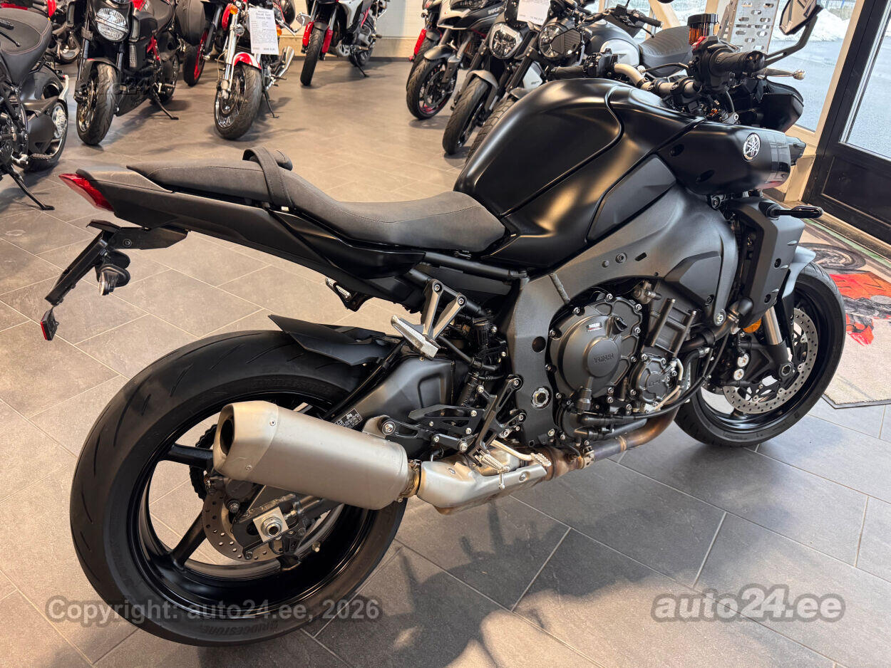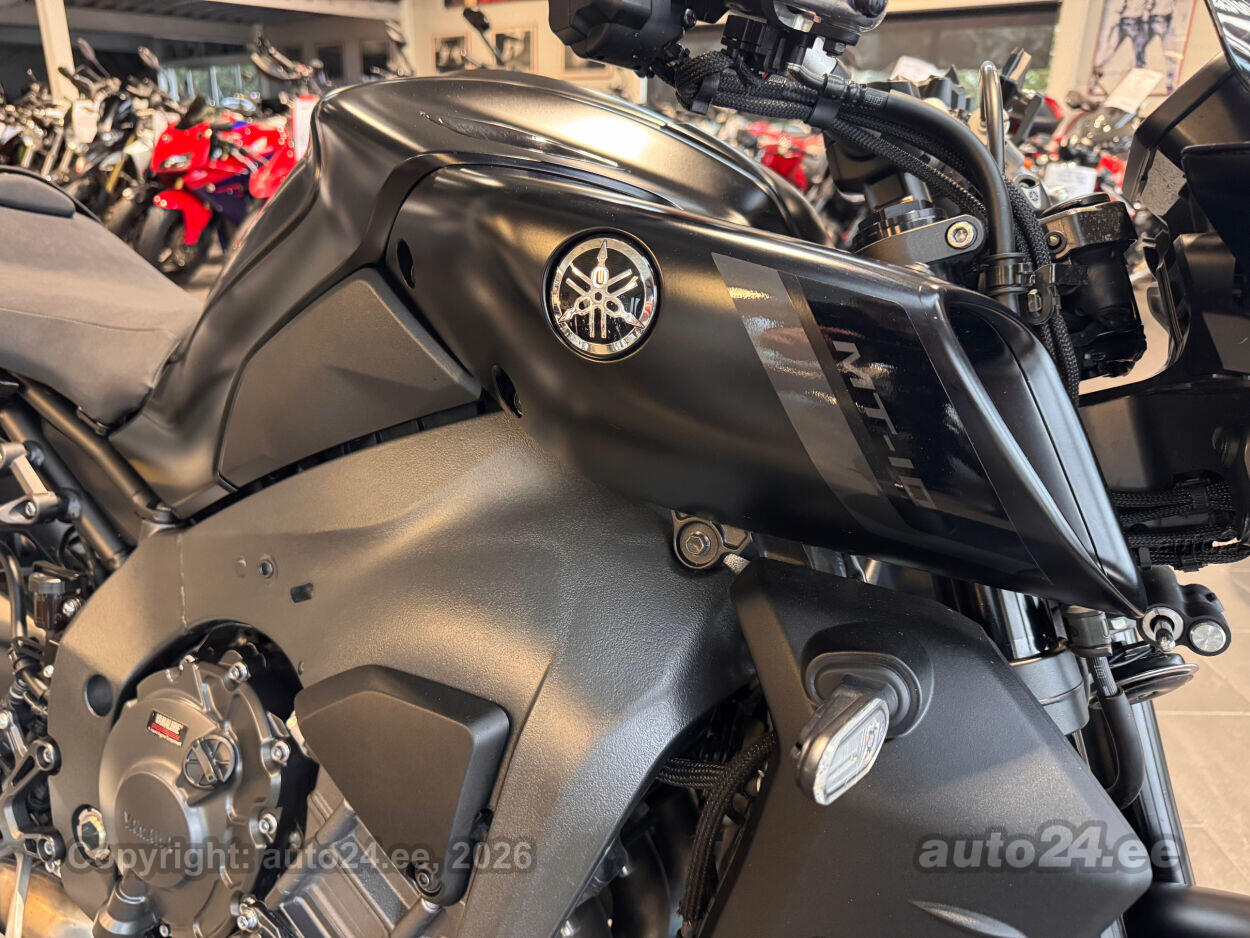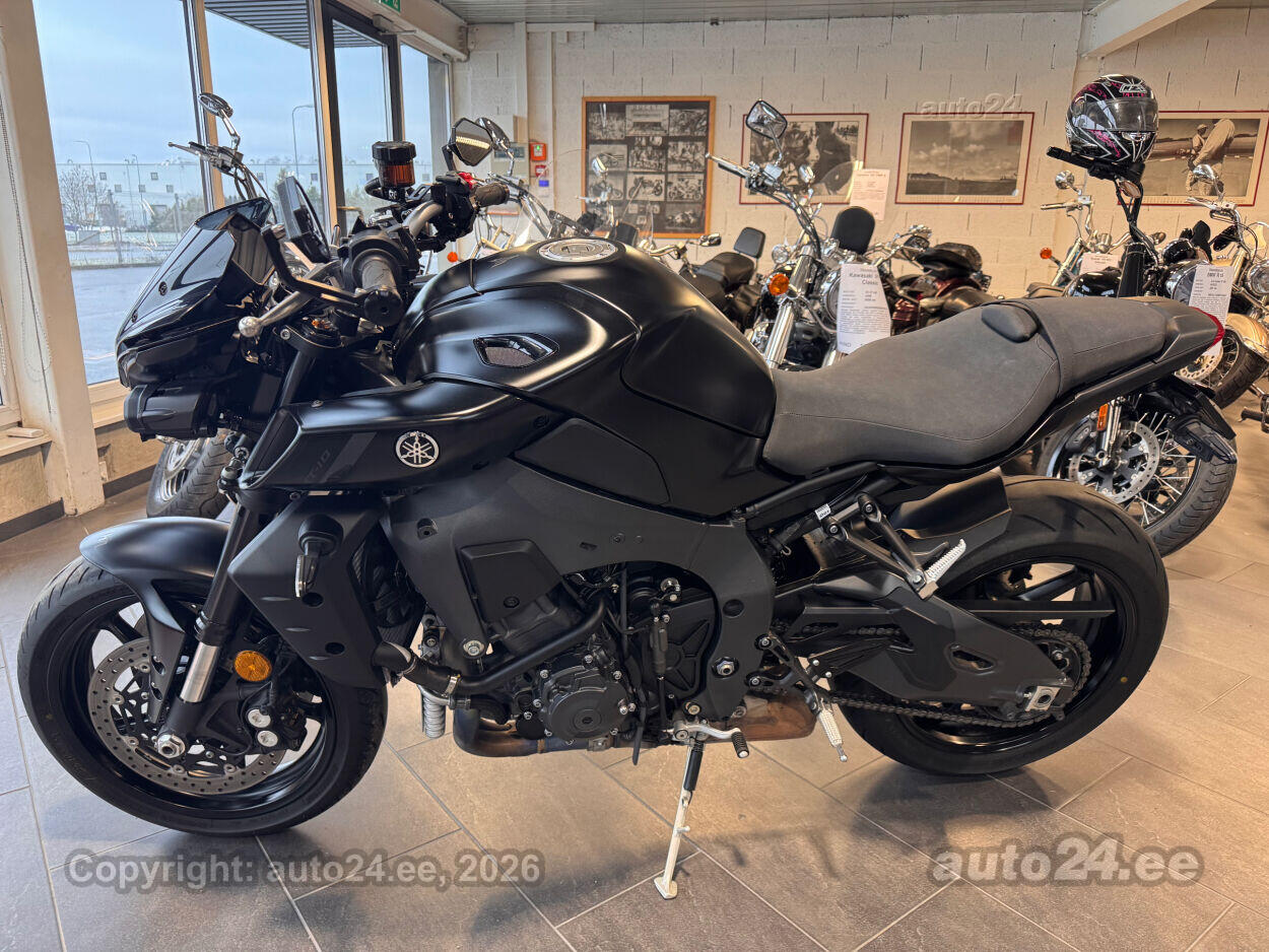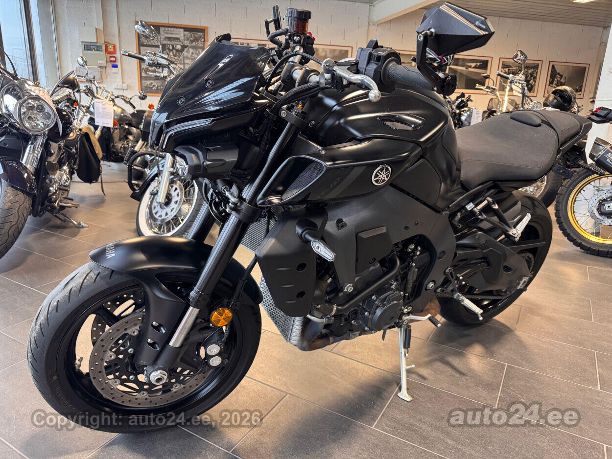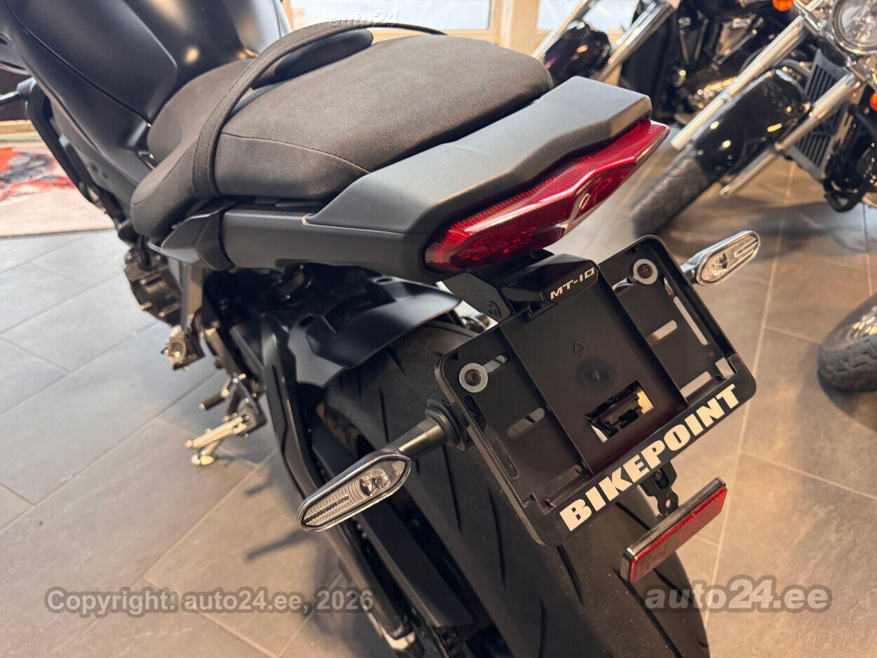 Varustus: Yamaha MT-10 – jõuline ja agressiivne naked-mootorratas, mis toob supersportlikud elamused tänavale. Võimas 998 cm3 R1-st tuletatud crossplane mootor pakub plahvatuslikku kiirendust ja erakordset juhitavust. Tipptasemel elektroonika, sealhulgas erinevad sõidurežiimid, veojõukontroll ja quickshifter, tagavad sujuva ja kontrollitud sõidu. Tugev raam ja sportlik reguleeritav vedrustus pakuvad kindlust nii kurvides kui ka sirgetel lõikudel. Mattmust viimistlus rõhutab mootorratta metsikut ja jõulist iseloomu. Püsikiirusehoidja annab mugavuse pikematel sõitudel. Yamaha MT-10 on ideaalne valik kui otsid adrenaliini ja kompromissitut jõudlust!