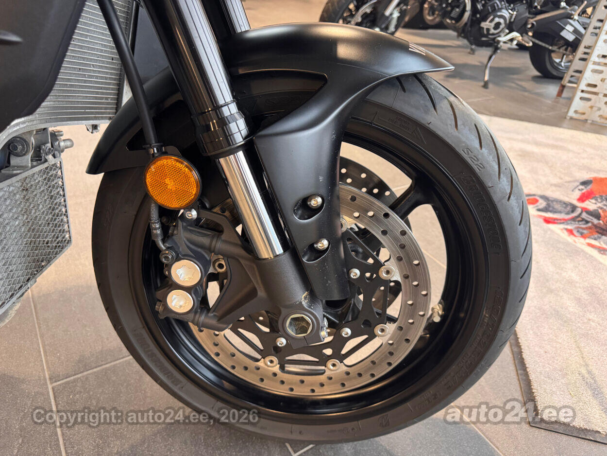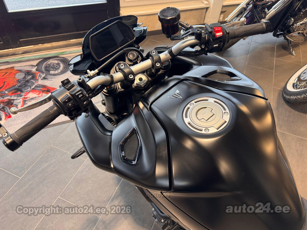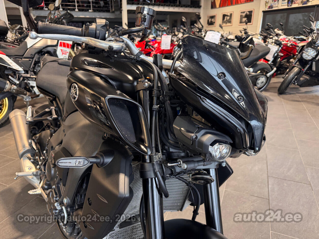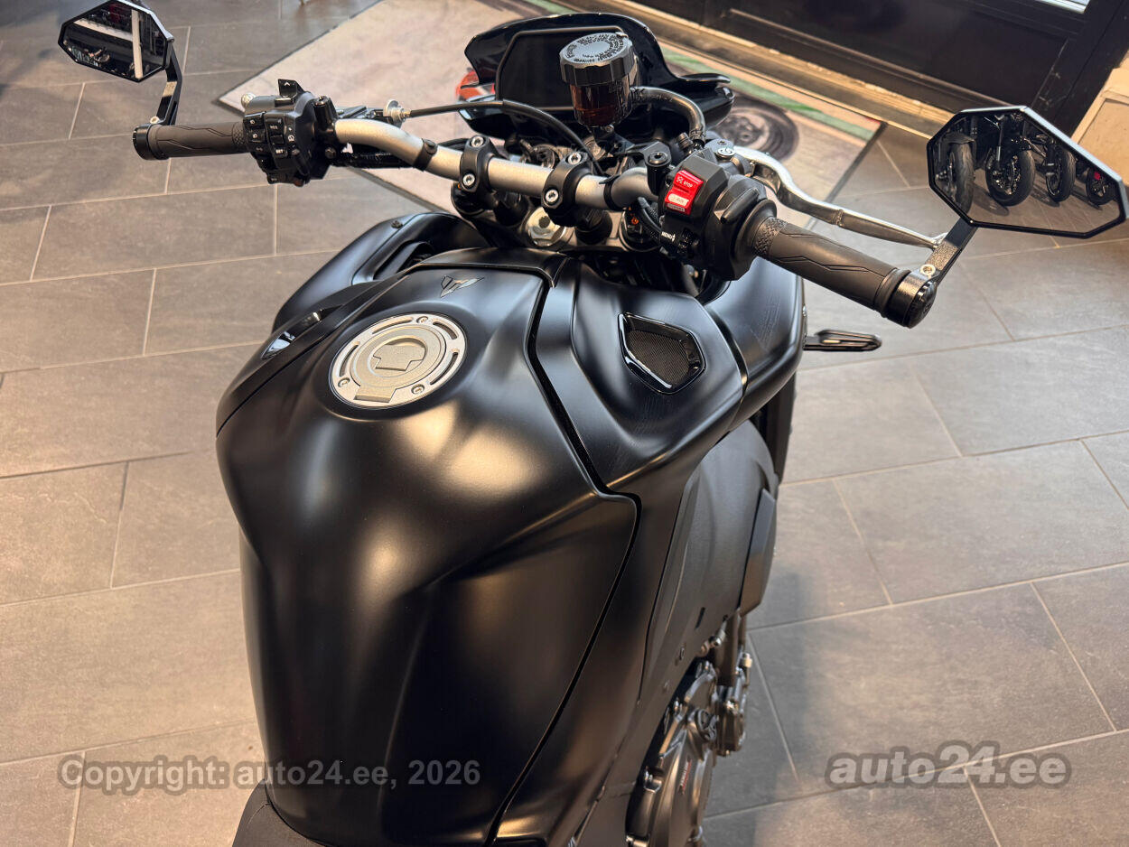 Varustus: Yamaha MT-10 – jõuline ja agressiivne naked-mootorratas, mis toob supersportlikud elamused tänavale. Võimas 998 cm3 R1-st tuletatud crossplane mootor pakub plahvatuslikku kiirendust ja erakordset juhitavust. Tipptasemel elektroonika, sealhulgas erinevad sõidurežiimid, veojõukontroll ja quickshifter, tagavad sujuva ja kontrollitud sõidu. Tugev raam ja sportlik reguleeritav vedrustus pakuvad kindlust nii kurvides kui ka sirgetel lõikudel. Mattmust viimistlus rõhutab mootorratta metsikut ja jõulist iseloomu. Püsikiirusehoidja annab mugavuse pikematel sõitudel. Yamaha MT-10 on ideaalne valik kui otsid adrenaliini ja kompromissitut jõudlust!