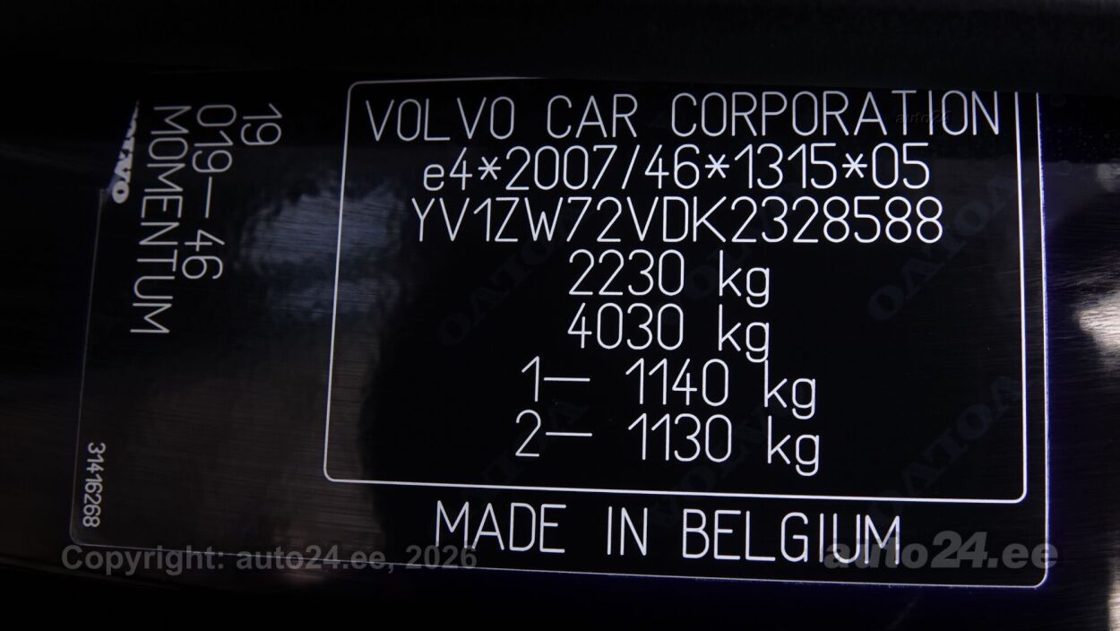 | Varustus: | kliimaautomaatik, roolivõimendi, kesklukustus (puldiga), ABS pidurid, turvapadi, elektrooniline seisupidur, immobilisaator, lisapidurituli, stabiilsuskontroll, pidurdusjõukontroll, veojõukontroll, vihmasensor, ISOFIX lasteistme kinnitus (taga), kõrvalistuja turvapadja väljalülitamise võimalus, jahutusega kindalaegas, laser, LED (tagatuled, päevatuled, lähituled, kaugtuled), päevasõidutulede automaatne lülitus, suverehvid, valuveljed (VOLVO originaal), rehvirõhu kontrollsüsteem, reguleeritav roolisammas (kõrgus ja sügavus), multifunktsionaalne rool, nahkkattega rool, stereo (originaal), kõlarid, navigatsiooniseade (kaardiga, hääljuhtimisega), autokompuuter, käed vabad süsteem, iluliistud salongis, jalamatid (tekstiilist), topsihoidjad (taga), poolnahkpolster, elektriliselt reguleeritavad istmed, istmed reguleeritava kõrgusega (juhiiste), 2x istmesoojendused, käetugi ees, käetugi taga, Comfort istmed, elektrilised välispeeglid (soojendusega, kokkuklapitavad), 4x elektrilised akende tõstukid, püsikiiruse hoidja, 2x peeglid päikesesirmides, automaatselt tumenevad peeglid (sees), kohtvalgustid, parkimisandurid (ees, taga), võtmeta käivitus, start-stopp süsteem, 12v pistikupesad, pakiruumi avamine elektriliselt, tagaklaasi soojendus, välistemperatuuri näidik, tagaklaasi puhasti |