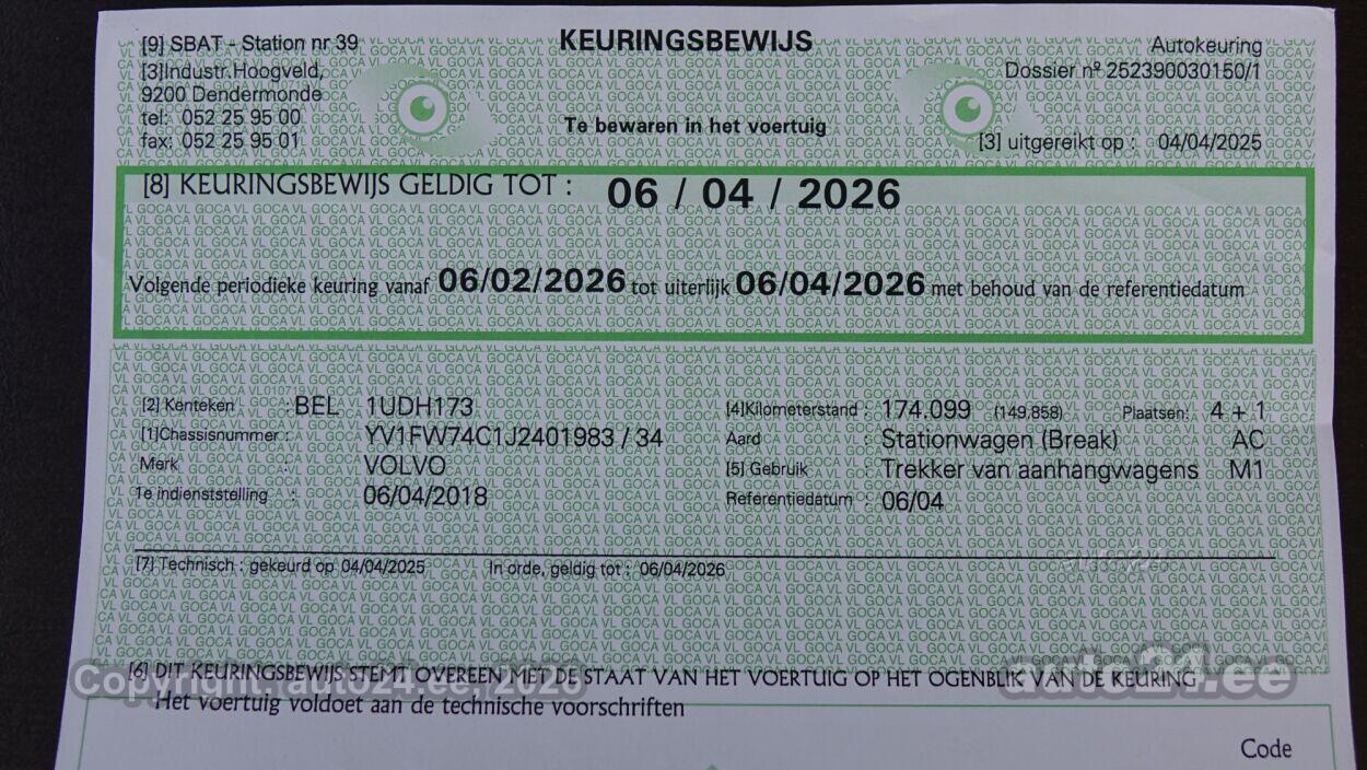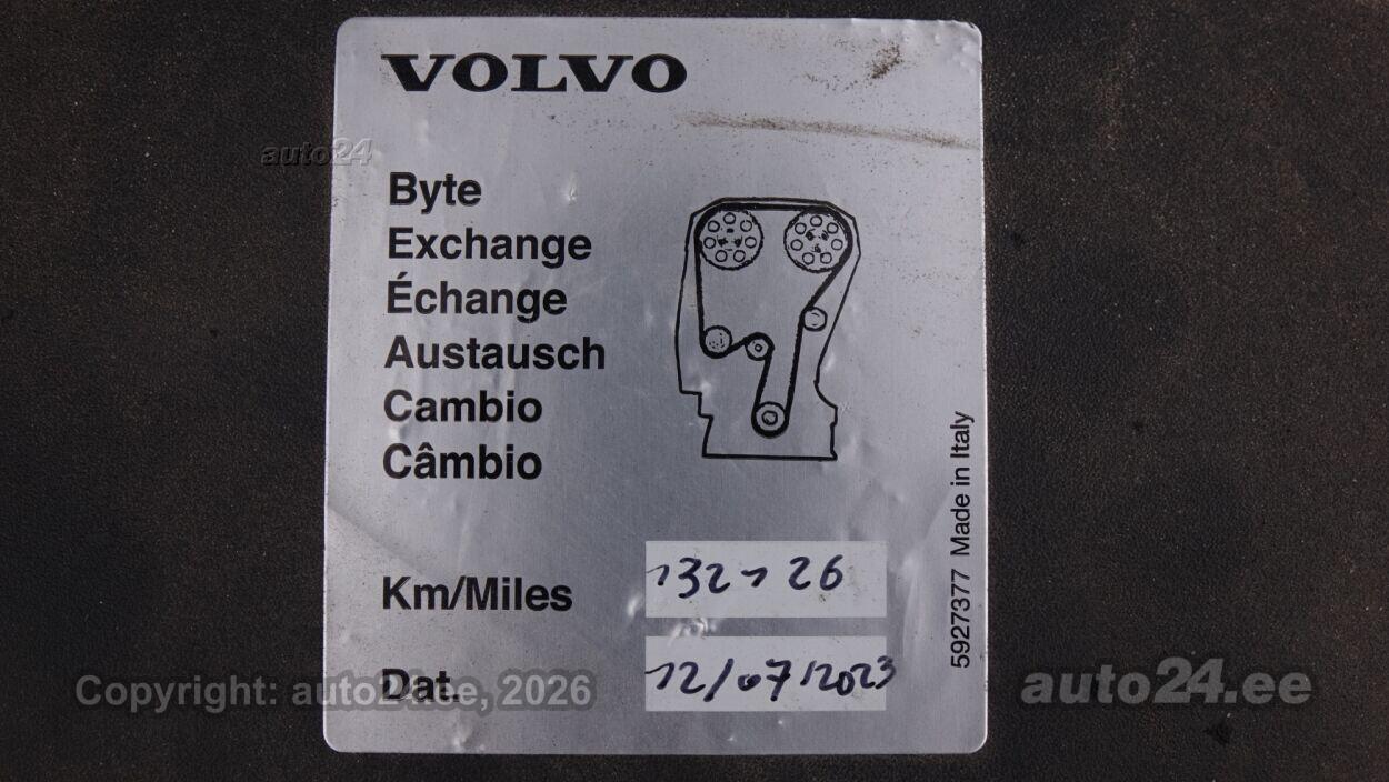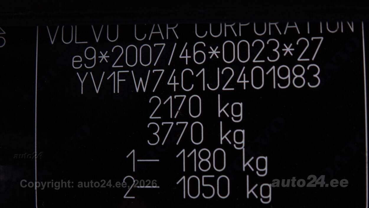 | Varustus: | kliimaautomaatik, roolivõimendi, kesklukustus (puldiga), ABS pidurid, turvapadi, elektrooniline seisupidur, immobilisaator, lisapidurituli, stabiilsuskontroll, pidurdusjõukontroll, veojõukontroll, vihmasensor, ISOFIX lasteistme kinnitus (taga), kõrvalistuja turvapadja väljalülitamise võimalus, jahutusega kindalaegas, udutuled (eesmised, tagumine), LED (tagatuled, päevatuled), päevasõidutulede automaatne lülitus, valuveljed (VOLVO originaal), reguleeritav roolisammas (kõrgus ja sügavus), multifunktsionaalne rool, stereo (originaal), kõlarid, ekraan (ees), navigatsiooniseade (kaardiga, hääljuhtimisega), autokompuuter, käed vabad süsteem, jalamatid (tekstiilist), pagasiruumi matt, topsihoidjad, tekstiilpolster, istmed reguleeritava kõrgusega (juhiiste), käetugi ees, käetugi taga, Comfort istmed, elektrilised välispeeglid (soojendusega), elektrilised akende tõstukid, püsikiiruse hoidja, peeglid päikesesirmides, automaatselt tumenevad peeglid (sees), kohtvalgustid, parkimisandurid (taga), tagavararatas, start-stopp süsteem, 12v pistikupesad, veokonks, tagaklaasi soojendus, välistemperatuuri näidik |