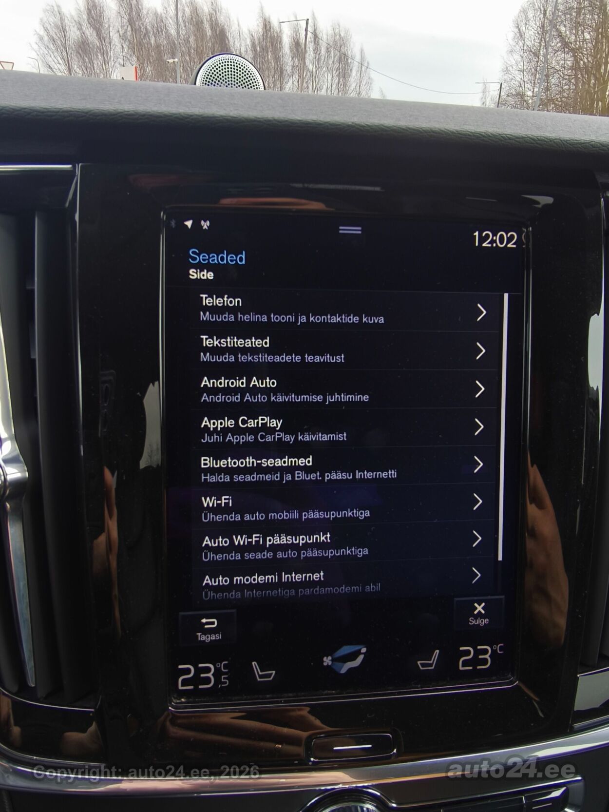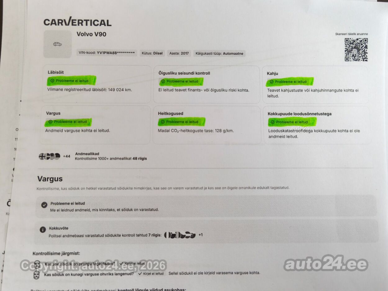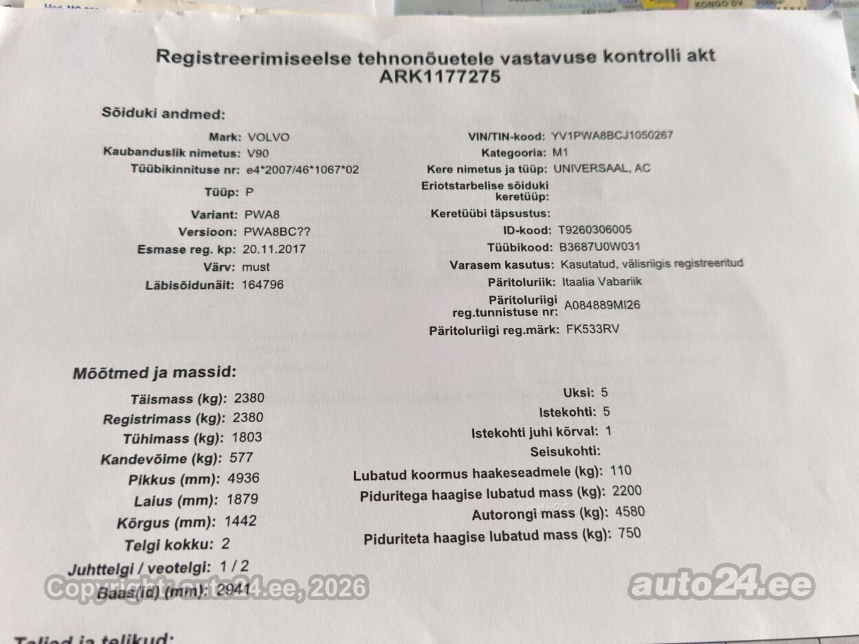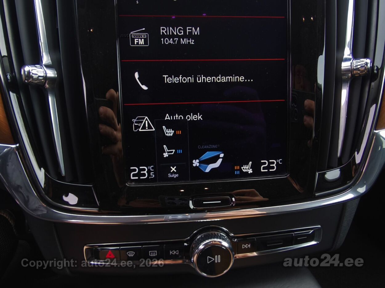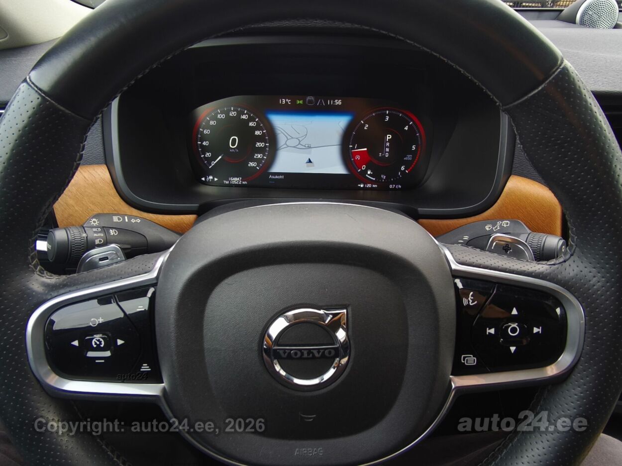 | Varustus: | kliimaautomaatik, automaatpidurdussüsteem, roolivõimendi (kiirustundlik), kesklukustus (puldiga), ABS pidurid, elektrooniline seisupidur, turvapadi, turvakardinad, immobilisaator, lisapidurituli, stabiilsuskontroll, sõiduraja hoidmise abisüsteem, sõiduraja vahetamise abisüsteem, liiklusmärkide tuvastus ja kuvamine, pimenurga hoiatus, veojõukontroll, turvavööde eelpingutid esiistmetel, vihmasensor, ISOFIX lasteistme kinnitus (taga), integreeritud lapseiste, kõrvalistuja turvapadja väljalülitamise võimalus, juhi väsimuse tuvastamise süsteem, valgustuspakett, udutuled, LED (päevatuled, tagatuled, lähituled, kaugtuled), esitulede pesurid, päevasõidutulede automaatne lülitus, kaugtulede ümberlülitamise assistent, MICHELIN suverehvid, valuveljed (19", VOLVO orig.), reguleeritav roolisammas (kõrgus ja sügavus), multifunktsionaalne rool, nahkkattega rool, käiguvahetus roolilt, BOWERS@WILKINS stereo (CD, MP3, USB pesaga, mälukaardi pesaga, originaal), helivõimendi, BOWERS@WILKINS kõlarid, subwoofer, Apple CarPlay, Android Auto, ekraan (ees), navigatsiooniseade (kaardiga, hääljuhtimisega), autokompuuter, BLUETOOTH käed vabad süsteem, iluliistud salongis (puitdekoor), taskud esiistmete seljatugedes, jalamatid (tekstiilist), topsihoidjad (ees, taga), nahkkattega käigukanginupp, nahkpolster, 2x õhuga reguleeritav iste, 2x elektriliselt reguleeritavad istmed (2x mäludega), istmed reguleeritava kõrgusega (juhiiste, kõrvalistuja iste), 2x istmesoojendused, ventileeritavad istmed (ees), käetugi ees (laekaga), käetugi taga (laekaga), kaassõitja istme seljatugi allaklapitav, tagaistme seljatugi allaklapitav, elektrilised välispeeglid (soojendusega, kokkuklapitavad, mäluga), 4x elektrilised akende tõstukid, toonitud klaasid, püsikiiruse hoidja (eessõitjaga distantsi hoidev), 2x peeglid päikesesirmides (valgustusega), eraldi kliimaseade tagaistmetele, automaatselt tumenevad peeglid (sees), kohtvalgustid, parkimisandurid (ees, taga), parkimiskaamera, Coming-/Leaving-Home funktsioon, digitaalne näidikutepaneel, info kuvamine esiklaasile, tagavararatas, võtmeta avamine, võtmeta käivitus, 12v pistikupesad, pakiruumi avamine elektriliselt (puldist), pagasikate (automaatne), katusereelingud, pagasi võrk pakiruumis, tagaklaasi soojendus, välistemperatuuri näidik, tagaklaasi puhasti, Head-Up Display (HUD), FULL LED Active High Beam, AWD, KEYLESS-GO, Kontrollitav läbisõit! |