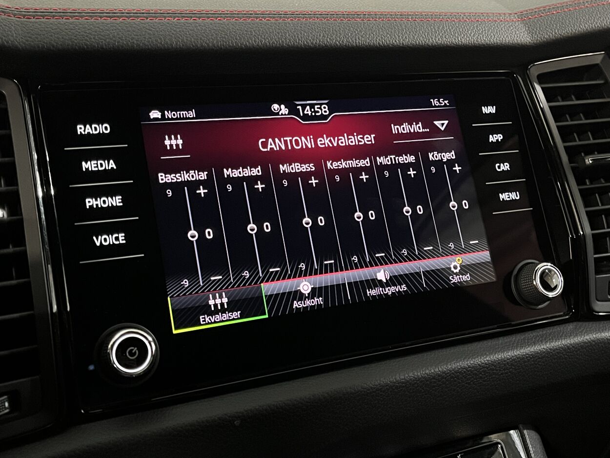 Audiosüsteem Canton: 4 kõlarit esiustes, 4 tagaustes, 1 keskel armatuurlauas, 1 aktiivbassikõlar pagasiruumis, digitaalne võimendi, koguvõimsus 575W,