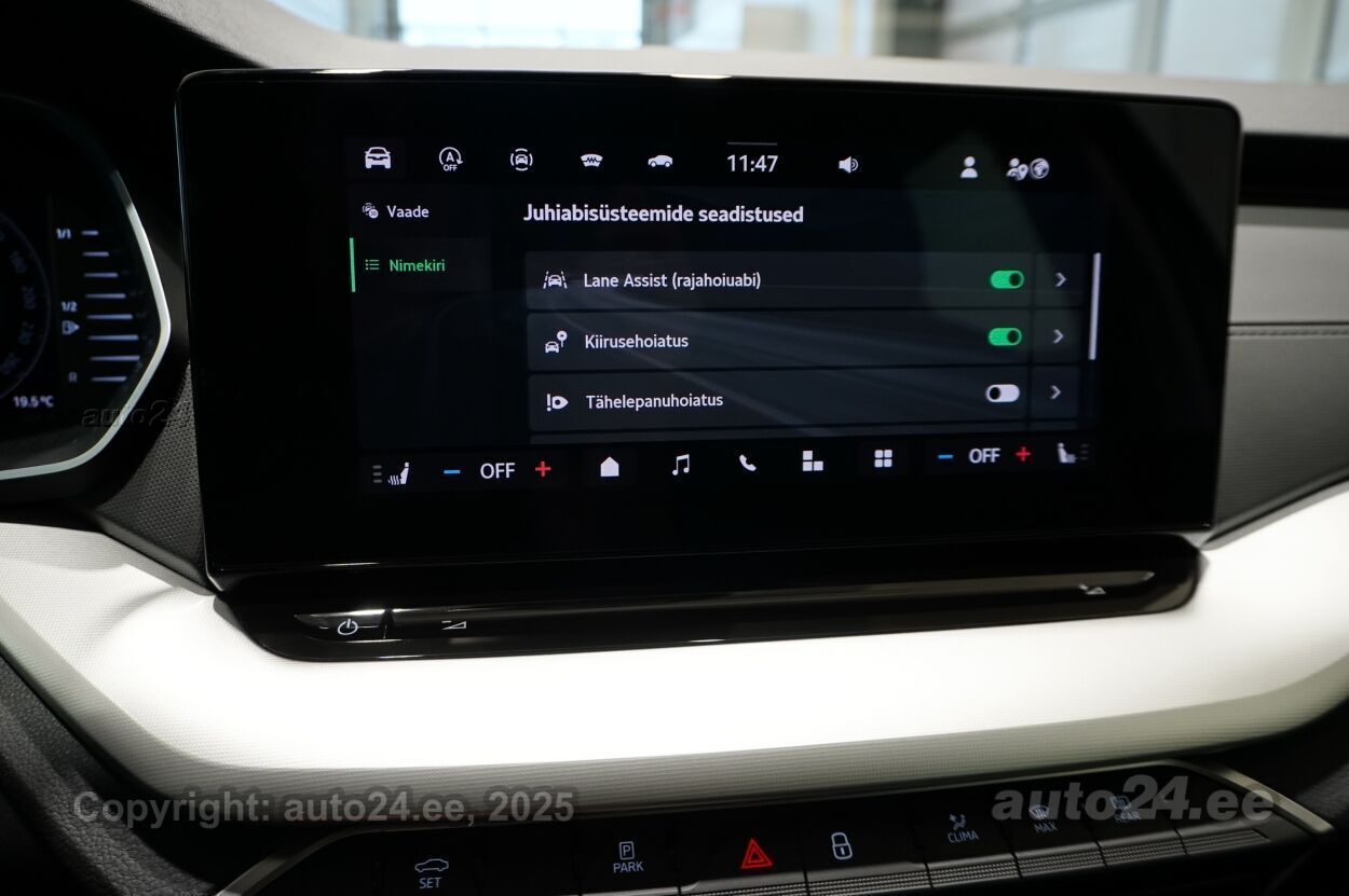 kliimaautomaatik, automaatpidurdussüsteem, roolivõimendi (kiirustundlik), kesklukustus (puldiga), ABS pidurid, elektrooniline seisupidur, turvapadi, turvakardinad, immobilisaator, signalisatsioon (kaldeanduriga, mahuanduriga), lisapidurituli, stabiilsuskontroll, kokkupõrget ennetav pidurisüsteem, sõiduraja hoidmise abisüsteem, pidurdusjõukontroll, liiklusmärkide tuvastus ja kuvamine, veojõukontroll, vihmasensor, ISOFIX lasteistme kinnitus (ees, taga), automaatne paigalseismise funktsioon / mägistardi abi, kõrvalistuja turvapadja väljalülitamise võimalus, juhi väsimuse tuvastamise süsteem, udutuled (tagumine), LED (päevatuled, tagatuled, lähituled, kaugtuled), päevasõidutulede automaatne lülitus, kaugtulede ümberlülitamise assistent, suverehvid, valuveljed, rehvirõhu kontrollsüsteem, reguleeritav roolisammas (kõrgus ja sügavus), multifunktsionaalne rool, nahkkattega rool, soojendusega rool, käiguvahetus roolilt, stereo (USB pesaga, originaal), kõlarid, Apple CarPlay, Android Auto, ekraan (ees), autokompuuter, käed vabad süsteem, iluliistud salongis, taskud esiistmete seljatugedes, jalamatid (tekstiilist, kummist), topsihoidjad (ees, taga), tekstiilpolster, istmed reguleeritava kõrgusega (juhiiste, kõrvalistuja iste), istmesoojendused, käetugi ees (laekaga), käetugi taga, tagaistme seljatugi allaklapitav, elektrilised välispeeglid (soojendusega, kokkuklapitavad), elektrilised akende tõstukid, toonitud klaasid, püsikiiruse hoidja, peeglid päikesesirmides, kohtvalgustid, parkimisandurid (ees, taga), parkimiskaamera, Coming-/Leaving-Home funktsioon, digitaalne näidikutepaneel, tagavararatas, võtmeta avamine, võtmeta käivitus, start-stopp süsteem, 12v pistikupesad, reisiarvesti, pakiruumi avamine elektriliselt (puldist), pagasikate, kaubakinnituse konksud, elektrilise soojendusega esiklaas, tagaklaasi soojendus, välistemperatuuri näidik, esi- ja tagarataste porikummid, 17" valuveljed Mensa Aero, rehvid 205/55 R17, Varuratas terasveljel, rehv 205/60 R16, 2-kodaraga soojendusega nahkrool raadio ja telefoni juhtimise ning DSG käiguvahetusega roolilt, Soojendusega esiklaas (integreeritud soojenduskile), Tagastange kaitsekleebis, Täis kütusepaak |