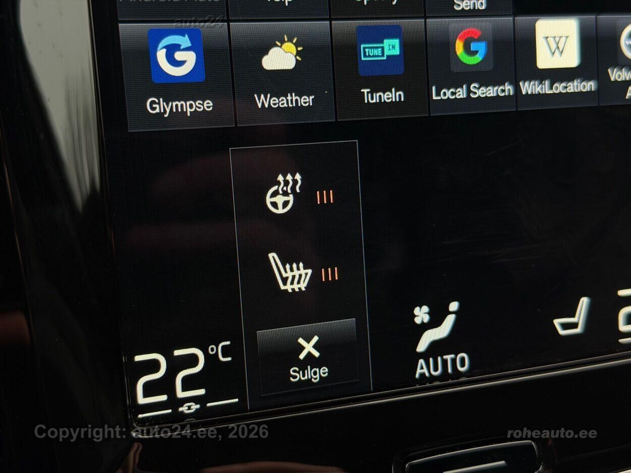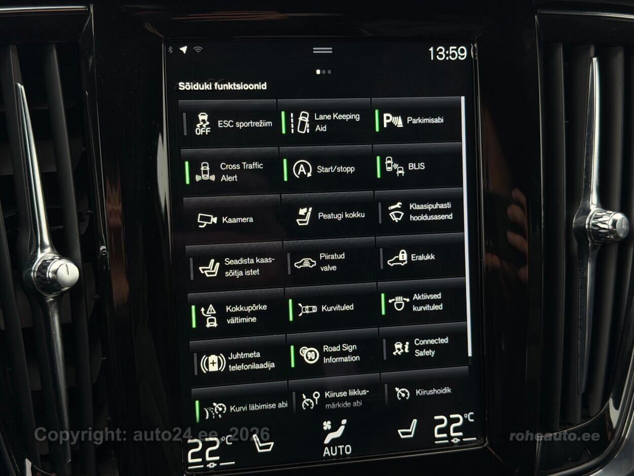 kliimaautomaatik, roolivõimendi, kesklukustus (puldiga), ABS pidurid, elektrooniline seisupidur, 5x turvapadi, turvakardinad, immobilisaator, signalisatsioon, lisapidurituli, stabiilsuskontroll, kokkupõrget ennetav pidurisüsteem, Lane Assist sõiduraja hoidmise abisüsteem, pidurdusjõukontroll, sõiduraja vahetamise abisüsteem, liiklusmärkide tuvastus ja kuvamine, pimenurga hoiatus, veojõukontroll, turvavööde eelpingutid esiistmetel, vihmasensor, ISOFIX lasteistme kinnitus (taga), automaatne paigalseismise funktsioon / mägistardi abi, kõrvalistuja turvapadja väljalülitamise võimalus, juhi väsimuse tuvastamise süsteem, valgustuspakett, udutuled (eesmised, tagumine, kurvitule funktsiooniga), LED (päevatuled, tagatuled, lähituled, kaugtuled), esitulede pesurid, päevasõidutulede automaatne lülitus, kaugtulede ümberlülitamise assistent, kurvituled, valuveljed (21", Volvo), rehvirõhu kontrollsüsteem, reguleeritav roolisammas (kõrgus ja sügavus), multifunktsionaalne rool, nahkkattega rool, soojendusega rool, HARMAN / KARDON stereo (USB pesaga, mälukaardi pesaga, originaal), kõlarid, Apple CarPlay, Android Auto, ekraan (ees), navigatsiooniseade (kaardiga), autokompuuter, Bluetooth käed vabad süsteem, iluliistud salongis, taskud esiistmete seljatugedes, jalamatid (tekstiilist), topsihoidjad (ees, taga), nahkkattega käigukanginupp, tume laepolster, nahkpolster, 2x elektriliselt reguleeritavad istmed (2x mäludega), istmed reguleeritava kõrgusega (juhiiste, kõrvalistuja iste), 4x istmesoojendused, reguleeritava kumerusega seljatugi (juhiiste, kõrvalistuja iste), käetugi ees (laekaga), käetugi taga, tagaistme seljatugi allaklapitav, sportistmed, elektrilised välispeeglid (soojendusega, kokkuklapitavad, mäluga), 4x elektrilised akende tõstukid, toonitud klaasid, püsikiiruse hoidja (eessõitjaga distantsi hoidev), 2x peeglid päikesesirmides (valgustusega), 2x rulookardinad ustel, VOLVO äpp / taimer / kalender mootori eelsoojendus, VOLVO äpp / taimer / kalender salongi eelsoojendus, salongi lisasoojendus, automaatselt tumenevad peeglid (sees, väljas), uste sisevalgustus, kohtvalgustid, parkimisandurid (ees, taga), parkimiskaamera, Coming-/Leaving-Home funktsioon, digitaalne näidikutepaneel, telefoni juhtmevaba laadimine, võtmeta avamine, võtmeta käivitus, start-stopp süsteem, 12v pistikupesad, reisiarvesti, pakiruumi avamine elektriliselt (jalaviipega, puldist), pagasikate (automaatne), kaubakinnituse konksud, veokonks (elektriline, teisaldatav), tagaklaasi soojendus, aknapesupihustite sulatus, välistemperatuuri näidik, rehviparanduskomplekt, tagaklaasi puhasti, CTA - Tagumise ristliikluse jälgimissüsteem, Maatriks-LED esituled, VOLVO ON CALL - Võimaldab auto uksi avada/lukustada, mootorit käivitada, eelsoojendust juhtida ja asukohta jälgida |