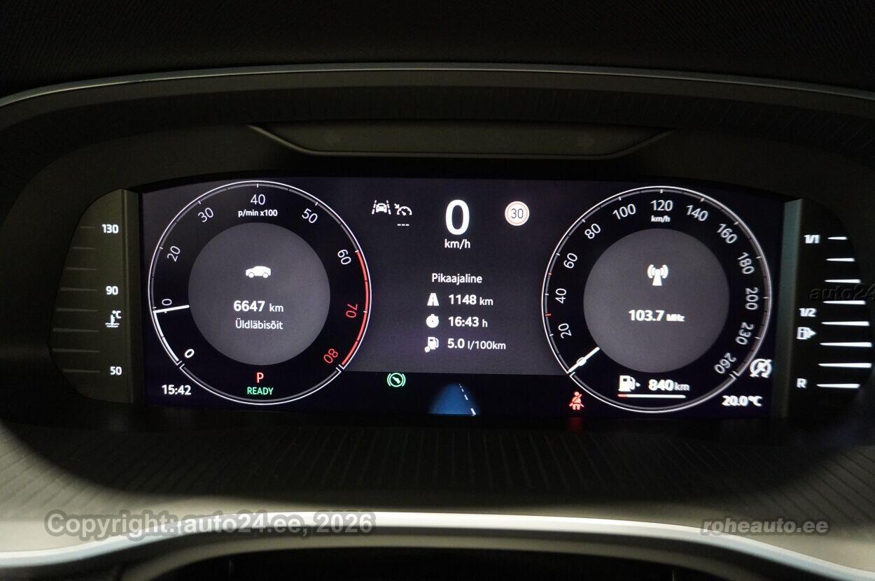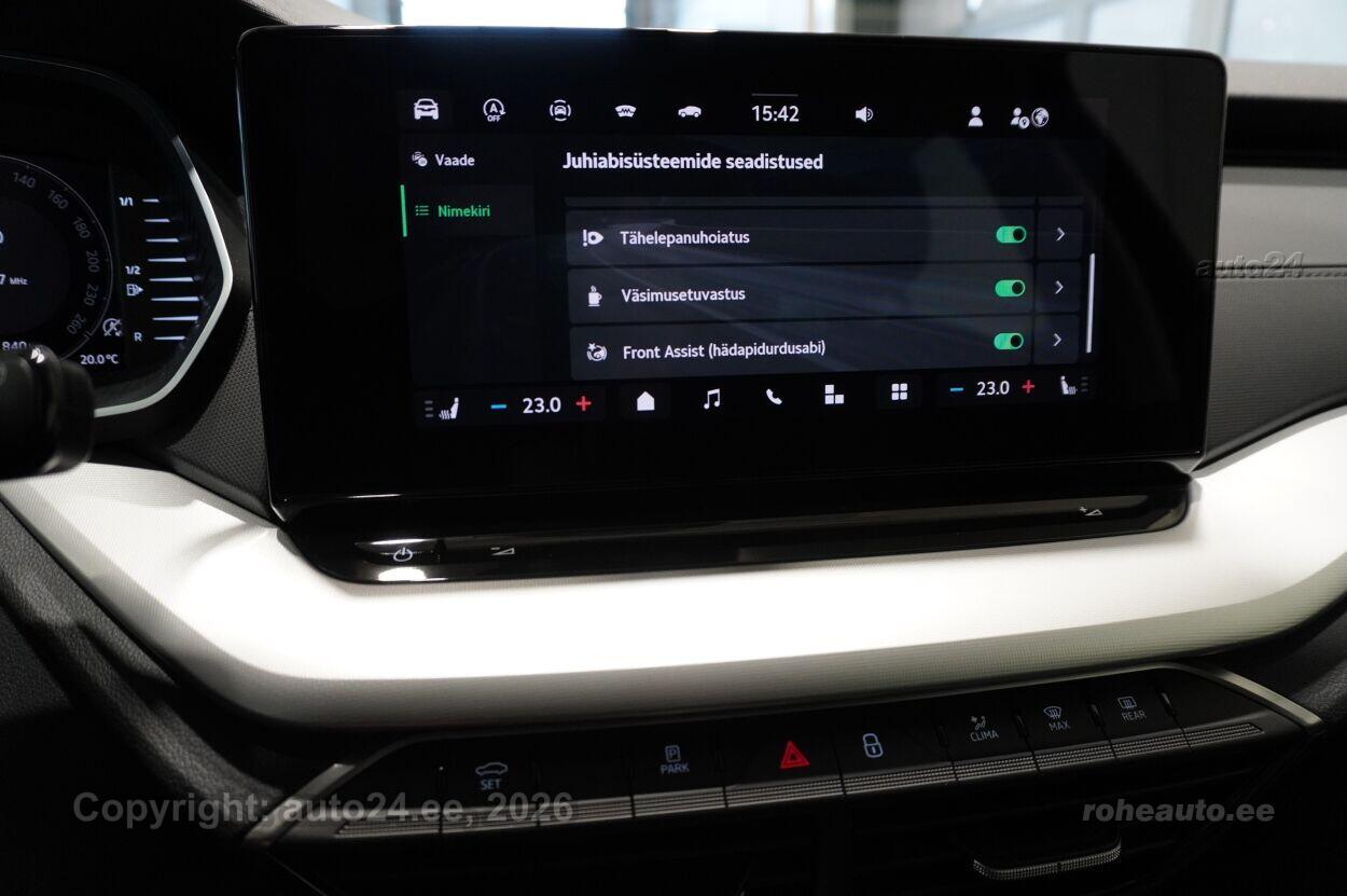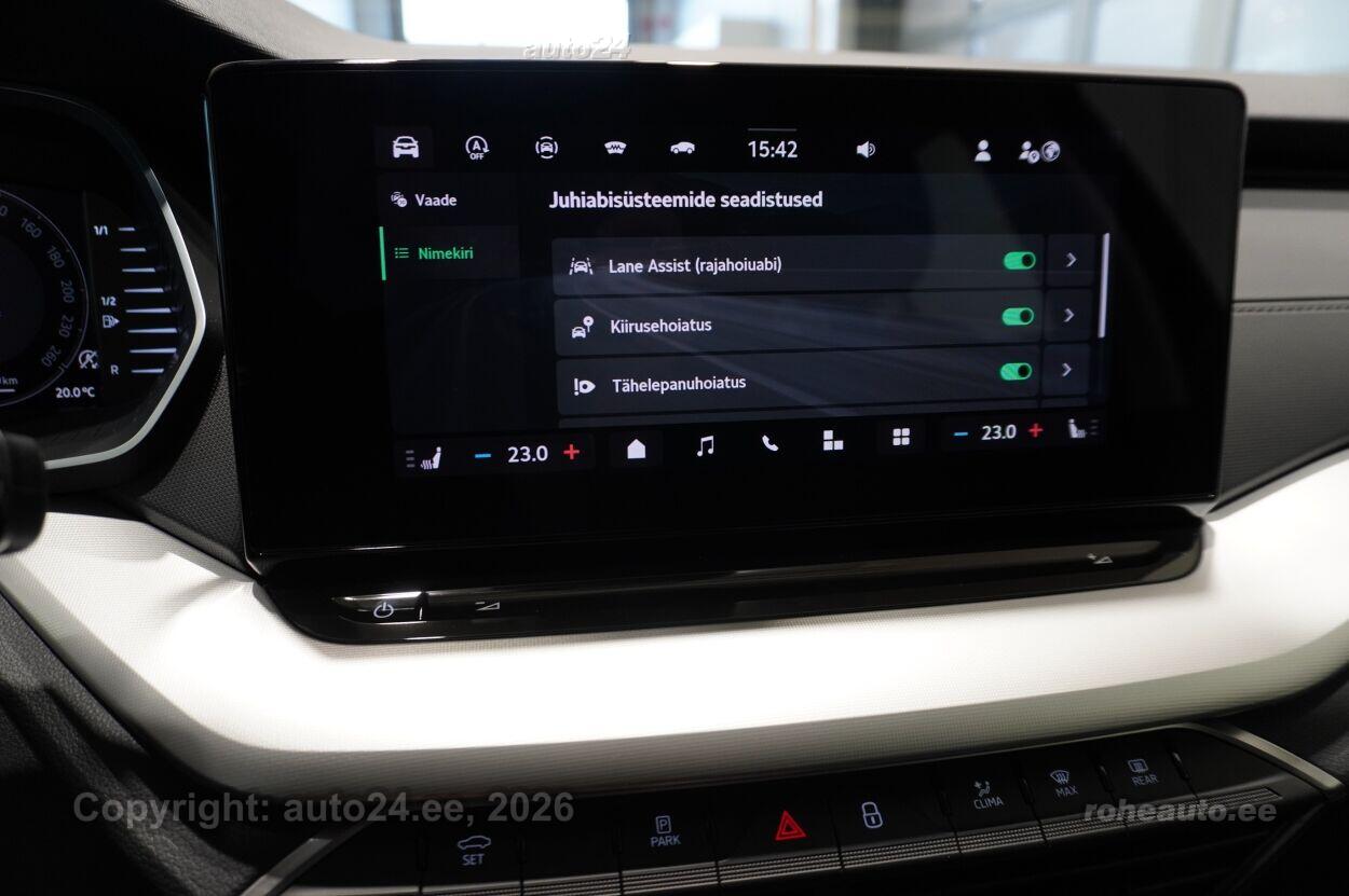 kliimaautomaatik, automaatpidurdussüsteem, roolivõimendi (kiirustundlik), kesklukustus (puldiga), ABS pidurid, elektrooniline seisupidur, turvapadi, turvakardinad, immobilisaator, signalisatsioon (kaldeanduriga, mahuanduriga), lisapidurituli, stabiilsuskontroll, kokkupõrget ennetav pidurisüsteem, pidurdusjõukontroll, sõiduraja hoidmise abisüsteem, liiklusmärkide tuvastus ja kuvamine, veojõukontroll, vihmasensor, ISOFIX lasteistme kinnitus (taga), automaatne paigalseismise funktsioon / mägistardi abi, kõrvalistuja turvapadja väljalülitamise võimalus, juhi väsimuse tuvastamise süsteem, udutuled (tagumine), LED (päevatuled, tagatuled, lähituled, kaugtuled), päevasõidutulede automaatne lülitus, kaugtulede ümberlülitamise assistent, suverehvid, valuveljed, autoga antakse kaasa (talverehvid), rehvirõhu kontrollsüsteem, reguleeritav roolisammas (kõrgus ja sügavus), multifunktsionaalne rool, nahkkattega rool, soojendusega rool, käiguvahetus roolilt, stereo (USB pesaga, originaal), kõlarid, Apple CarPlay, Android Auto, ekraan (ees), autokompuuter, käed vabad süsteem, iluliistud salongis, taskud esiistmete seljatugedes, jalamatid (tekstiilist, kummist), topsihoidjad (ees, taga), tekstiilpolster, istmed reguleeritava kõrgusega (juhiiste, kõrvalistuja iste), istmesoojendused, käetugi ees (laekaga), käetugi taga, tagaistme seljatugi allaklapitav, elektrilised välispeeglid (soojendusega, kokkuklapitavad), elektrilised akende tõstukid, toonitud klaasid, püsikiiruse hoidja, kohtvalgustid, parkimisandurid (ees, taga), parkimiskaamera, Coming-/Leaving-Home funktsioon, digitaalne näidikutepaneel, tagavararatas, võtmeta avamine, võtmeta käivitus, start-stopp süsteem, 12v pistikupesad, reisiarvesti, paigaldatud tulekustuti, pakiruumi avamine elektriliselt (puldist), pagasikate, katusereelingud, kaubakinnituse konksud, elektrilise soojendusega esiklaas, tagaklaasi soojendus, välistemperatuuri näidik, esi- ja tagarataste porikummid, tagaklaasi puhasti, 17" valuveljed Mensa Aero, rehvid 205/55 R17, Varuratas terasveljel, rehv 205/60 R16, 2-kodaraga soojendusega nahkrool raadio ja telefoni juhtimise ning DSG käiguvahetusega roolilt, Soojendusega esiklaas (integreeritud soojenduskile), Tagastange kaitsekleebis, Täis kütusepaak |