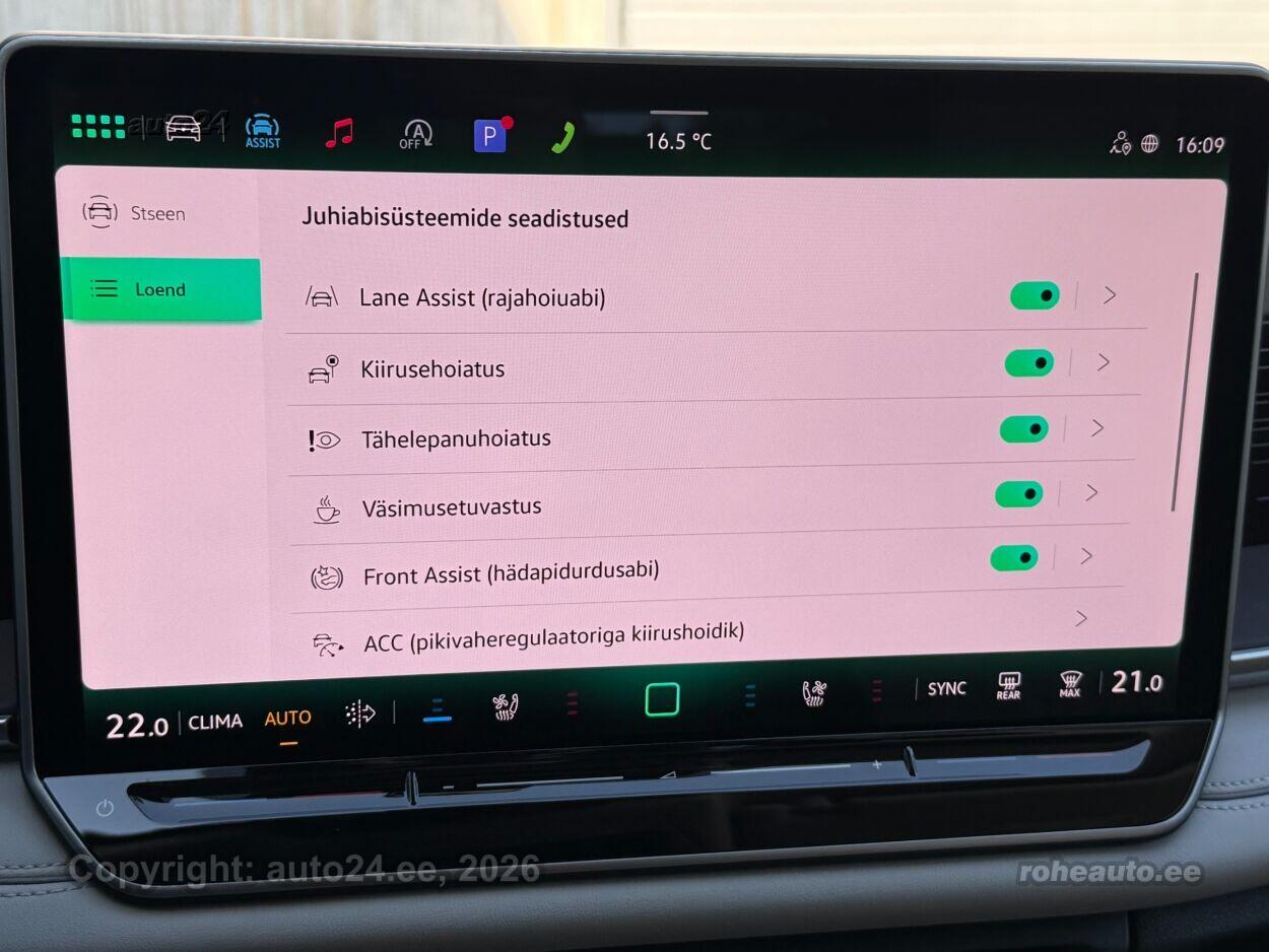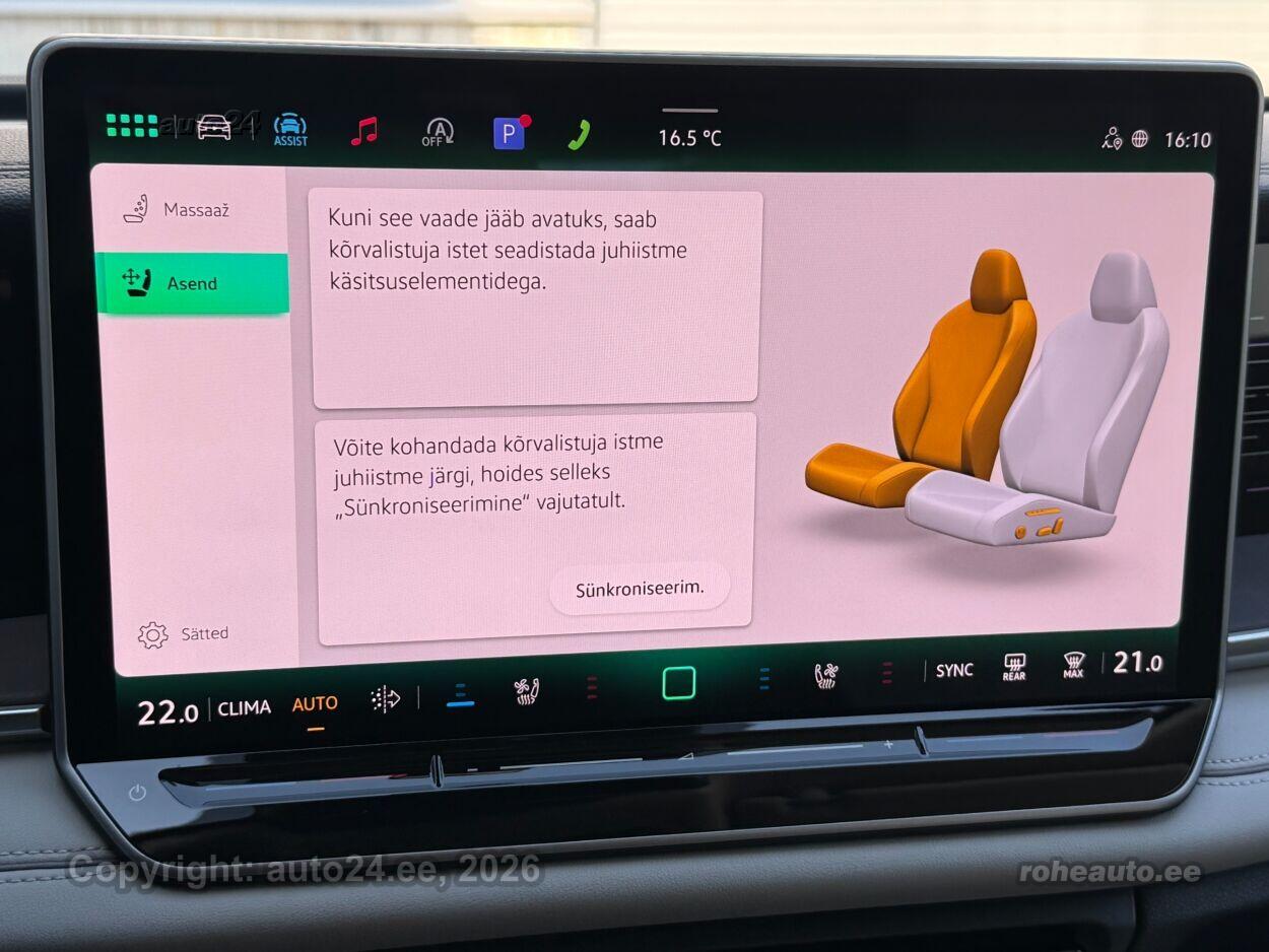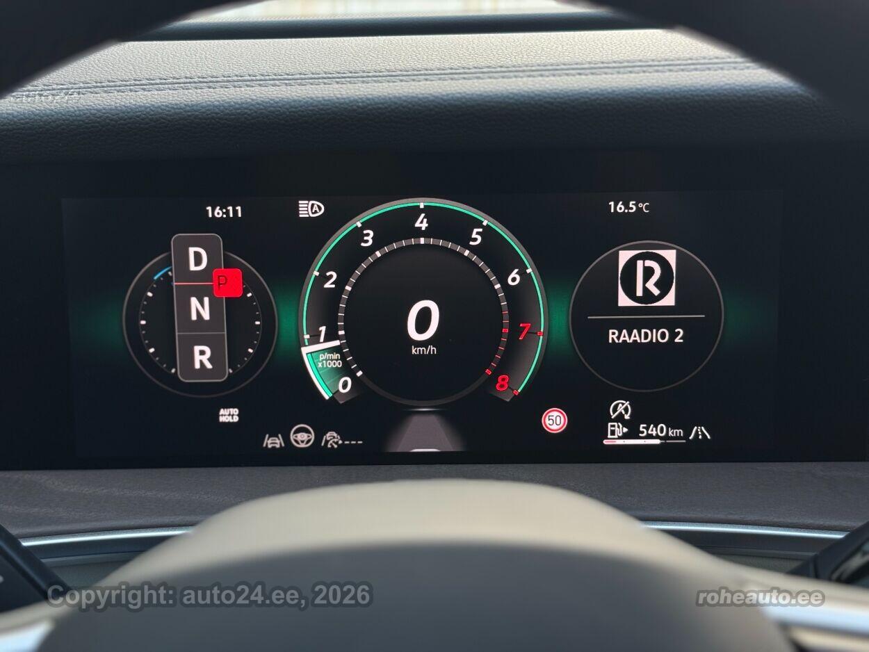 kliimaautomaatik, automaatpidurdussüsteem, roolivõimendi, kesklukustus (puldiga), ABS pidurid, elektrooniline seisupidur, turvapadi, turvakardinad, immobilisaator, signalisatsioon, lisapidurituli, stabiilsuskontroll, kokkupõrget ennetav pidurisüsteem, pidurdusjõukontroll, sõiduraja hoidmise abisüsteem, sõiduraja vahetamise abisüsteem, liiklusmärkide tuvastus ja kuvamine, pimenurga hoiatus, veojõukontroll, turvavööde eelpingutid esiistmetel, vihmasensor, ISOFIX lasteistme kinnitus, kõrvalistuja turvapadja väljalülitamise võimalus, automaatne paigalseismise funktsioon / mägistardi abi, juhi väsimuse tuvastamise süsteem, mägipidur, jahutusega kindalaegas, valgustuspakett, udutuled (eesmised, tagumine), LED (päevatuled, tagatuled, lähituled, kaugtuled), päevasõidutulede automaatne lülitus, kaugtulede ümberlülitamise assistent, kurvituled, talverehvid, valuveljed (R20, Vw), rehvirõhu kontrollsüsteem, reguleeritav roolisammas (kõrgus ja sügavus), multifunktsionaalne rool, nahkkattega rool, soojendusega rool, käiguvahetus roolilt, stereo (USB pesaga, originaal), Harman / Kardon helivõimendi, Harman / Kardon kõlarid, subwoofer, Apple CarPlay, Android Auto, ekraan, navigatsiooniseade, autokompuuter, käed vabad süsteem, iluliistud salongis (puitdekoor), taskud esiistmete seljatugedes, jalamatid (tekstiilist), topsihoidjad (ees, taga), nahkpolster, 2x elektriliselt reguleeritavad istmed (2x mäludega), istmed reguleeritava kõrgusega (juhiiste, kõrvalistuja iste), 2x istmesoojendused, reguleeritava kumerusega seljatugi (juhiiste, kõrvalistuja iste), massaažifunktsiooniga istmed (juhil, kõrvalistmel), ventileeritavad istmed (ees), käetugi ees (laekaga), käetugi taga, tagaistme seljatugi allaklapitav, Comfort istmed, elektrilised välispeeglid (soojendusega, kokkuklapitavad, mäluga), 4x elektrilised akende tõstukid, toonitud klaasid, püsikiiruse hoidja (eessõitjaga distantsi hoidev), 2x peeglid päikesesirmides (valgustusega), 2x rulookardinad ustel, eraldi kliimaseade tagaistmetele, automaatselt tumenevad peeglid, uste sisevalgustus, kohtvalgustid, parkimisandurid (ees, taga), automaatse parkimise funktsioon, parkimiskaamera (360), Coming-/Leaving-Home funktsioon, digitaalne näidikutepaneel, telefoni juhtmevaba laadimine, võtmeta avamine, võtmeta käivitus, start-stopp süsteem, 12v pistikupesad, reisiarvesti, reguleeritav vedrustus (jäikus), pakiruumi avamine elektriliselt (jalaviipega, puldist), pagasikate, katusereelingud, kaubakinnituse konksud, tagaklaasi soojendus, aknapesupihustite sulatus, välistemperatuuri näidik, topeltklaasid, tagaklaasi puhasti, IQ.HD Matrix LED tuled, Head-Up Display: Discover Pro Max, IQ.Drive juhiabipakett, Varenna nahaga istmed, soojendus, ventileerimise ja massaažiga |