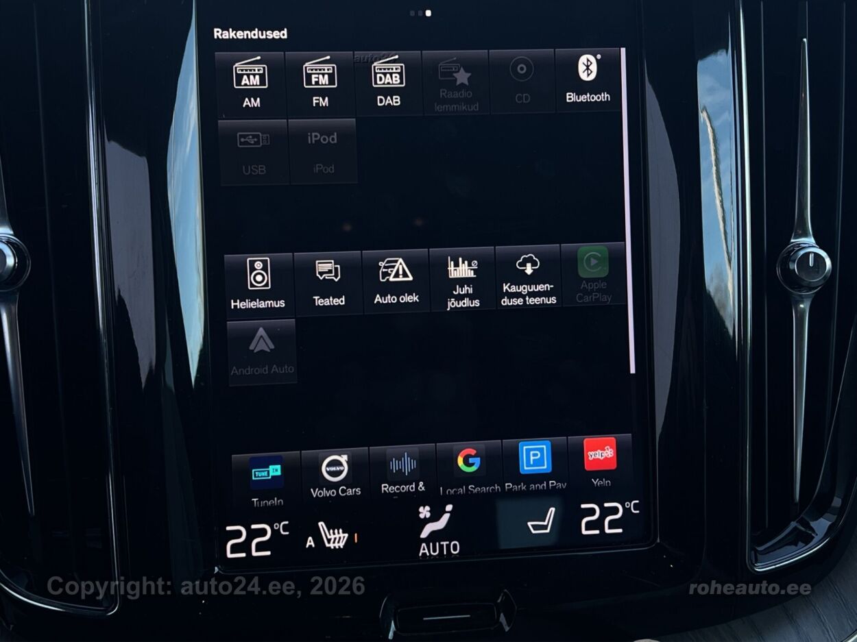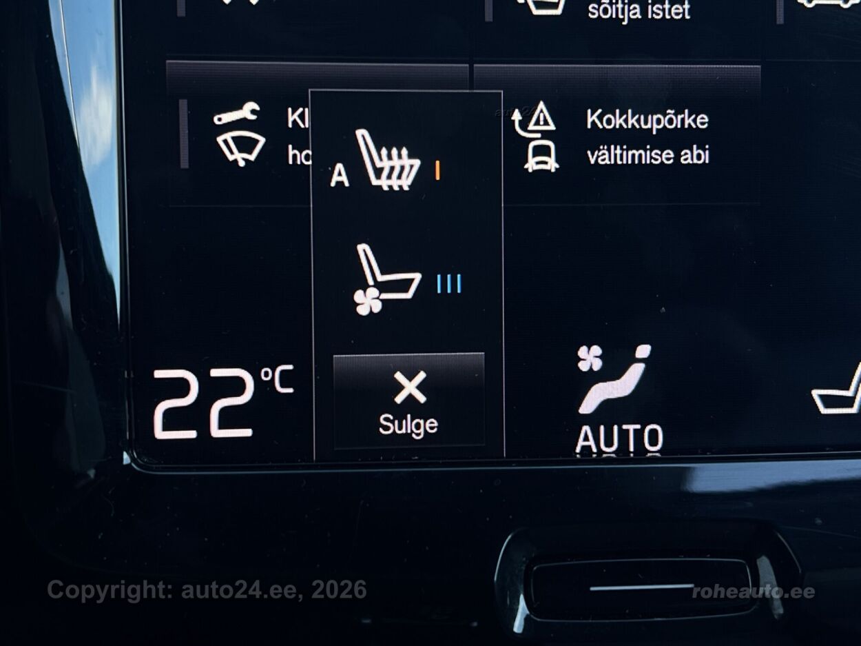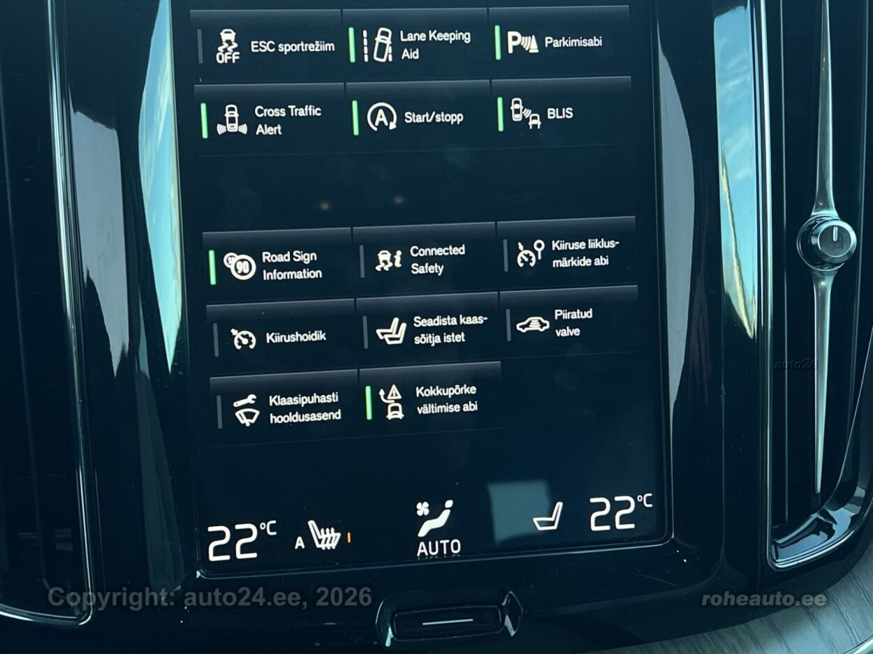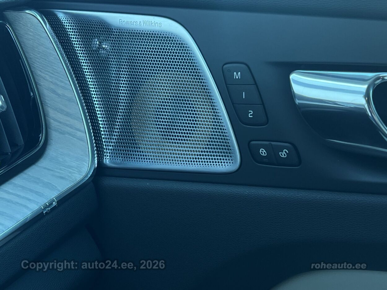 клима-автоматик, усилитель руля (чувствительный к скорости), центральный замок (с пультом), тормоза с АБС, электронный стояночный тормоз, 5x воздушная подушка, шторы безопасности, иммобилайзер, доп.стоп сигнал, система предотвращения столкновения, система контроля стабильного положения, система удержания полосы движения, система контроля тормозного усилия, ассистент смены полосы движения, система распознавания дорожных знаков, система контроля слепых зон, противобуксовочная система, датчик дождя, ISOFIX крепитель детских сидений (сзади), возможность выключит воздушную подушку переднего пассажира, система распознавания усталости водителя, горный тормоз, светопакет, противотуманные фонари (задний), LED (фары дневного света, задние фары, ближнего света, дальнего света), автоматическое включение фар, ассистент переключения дальнего света, литые диски (19, Volvo), система контроля давления в шинах, регулируемый руль (по высоте и глубине), многофункциональный руль, руль обшитый кожей, BOWERS / WILKINS стерео (CD, MP3, гнездо для USB, оригинальное), усилитель звука, сабвуфер, Apple CarPlay, Android Auto, экран (спереди), система навигации (с картой, управляемый голосом), компьютер, система "hands free", декоративные накладки в салоне (деревянный декор), коврики (велюровые), держатели стаканов (спереди, сзади), рукоятка переключения передач обшитая кожей, "Agnes, Blond" кожаная обивка, 2x электрически регулируемые сиденья (2x с памятью), регулируемые по высоте сидения (водительское сидение, пассажирское сидение), 2x обогрев сидений, спинка с регулировкой выпуклости (водительское сидение, пассажирское сидение), вентилируемые сиденья (спереди), подлокотник спереди (с ящиком), подлокотник сзади (с ящиком), складывающаяся спинка заднего сиденья, Comfort сиденья, электрические зеркала заднего вида (с подогревом, складывающиеся, с памятью), 4x электрические стеклоподъемники, тонированные стекла, круиз контроль (с удержанием дистанции до переднего транспортного средство), 2x противосолнечные козырьки с зеркалами (с подсветкой), автоматически затемняемые зеркала (в салоне, внешние), местная подсветка, датчики парковки (спереди, сзади), безключевой доступ, безключевой запуск, старт-стоп система, 12v электрические розетки, электронное открывание багажника (движением ноги, с пульта), крышка багажного отделения, крючки крепления багажа, подогрев заднего стекла, подогрев форсунок омывателя, показатель температуры атмосферного воздуха, очиститель заднего стекла, CTA - üarkimiskohalt väljatagurdamise turvasüsteem, DAB raadio, Komfortistmed esiistmed- kõikide reguleerimisvõimalustega, soojendusega, ventileeritavad ning mäludega |