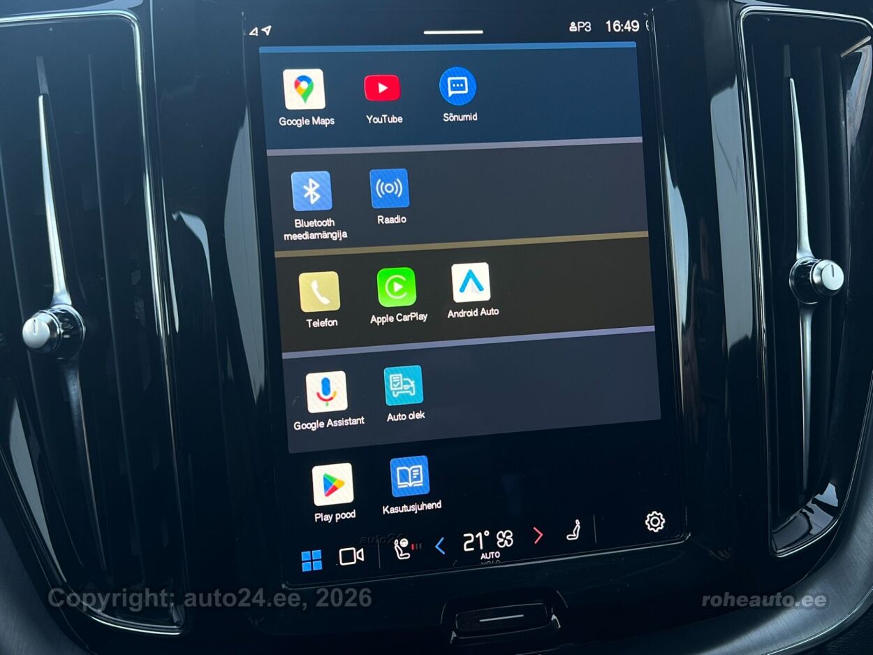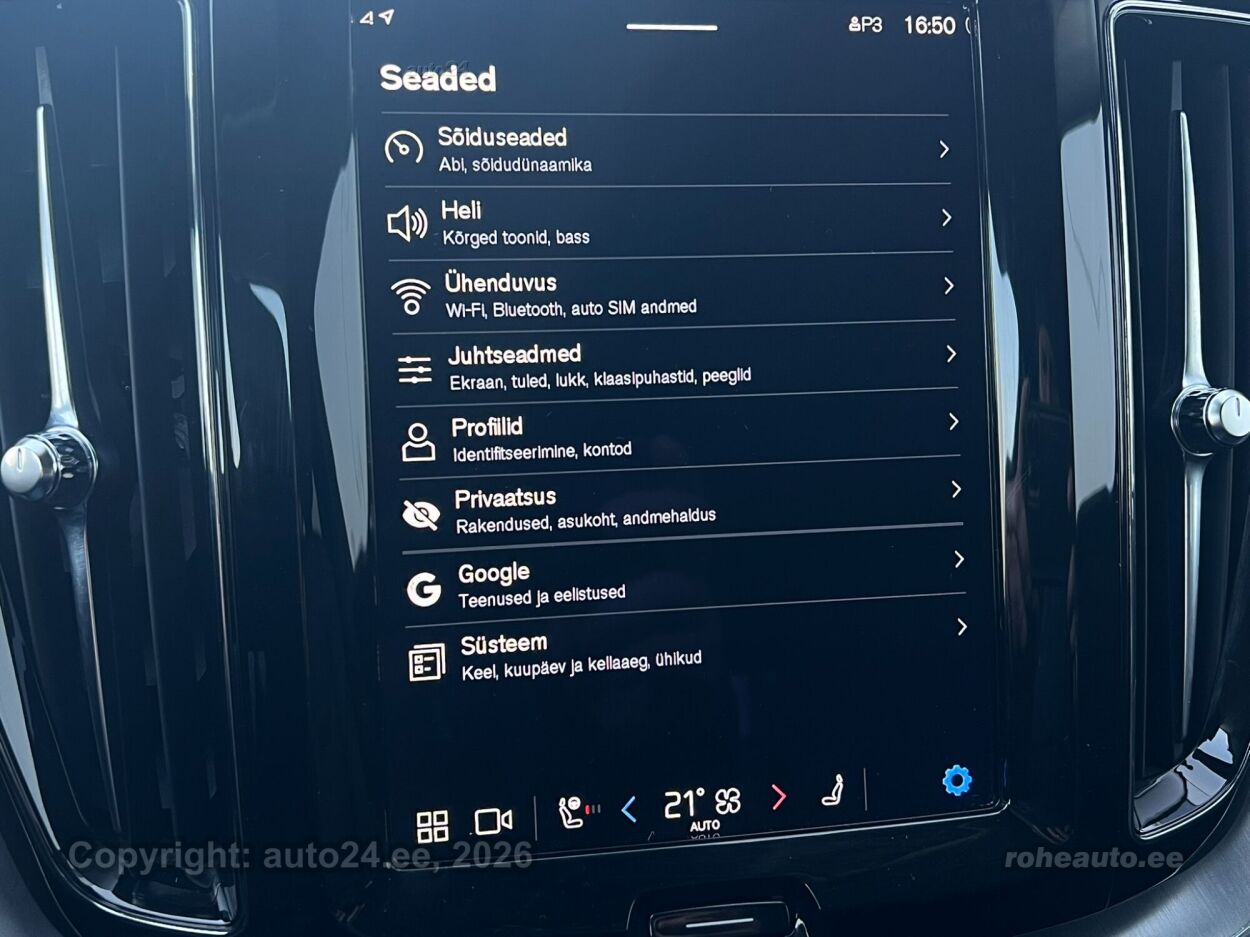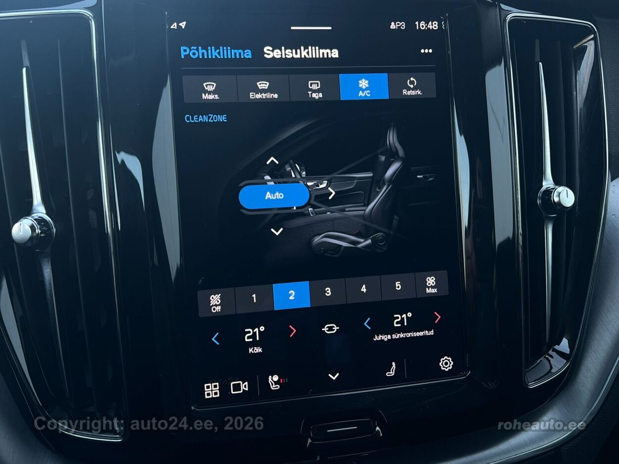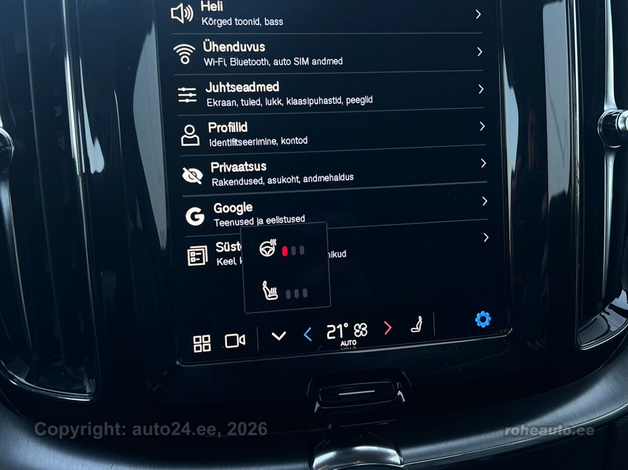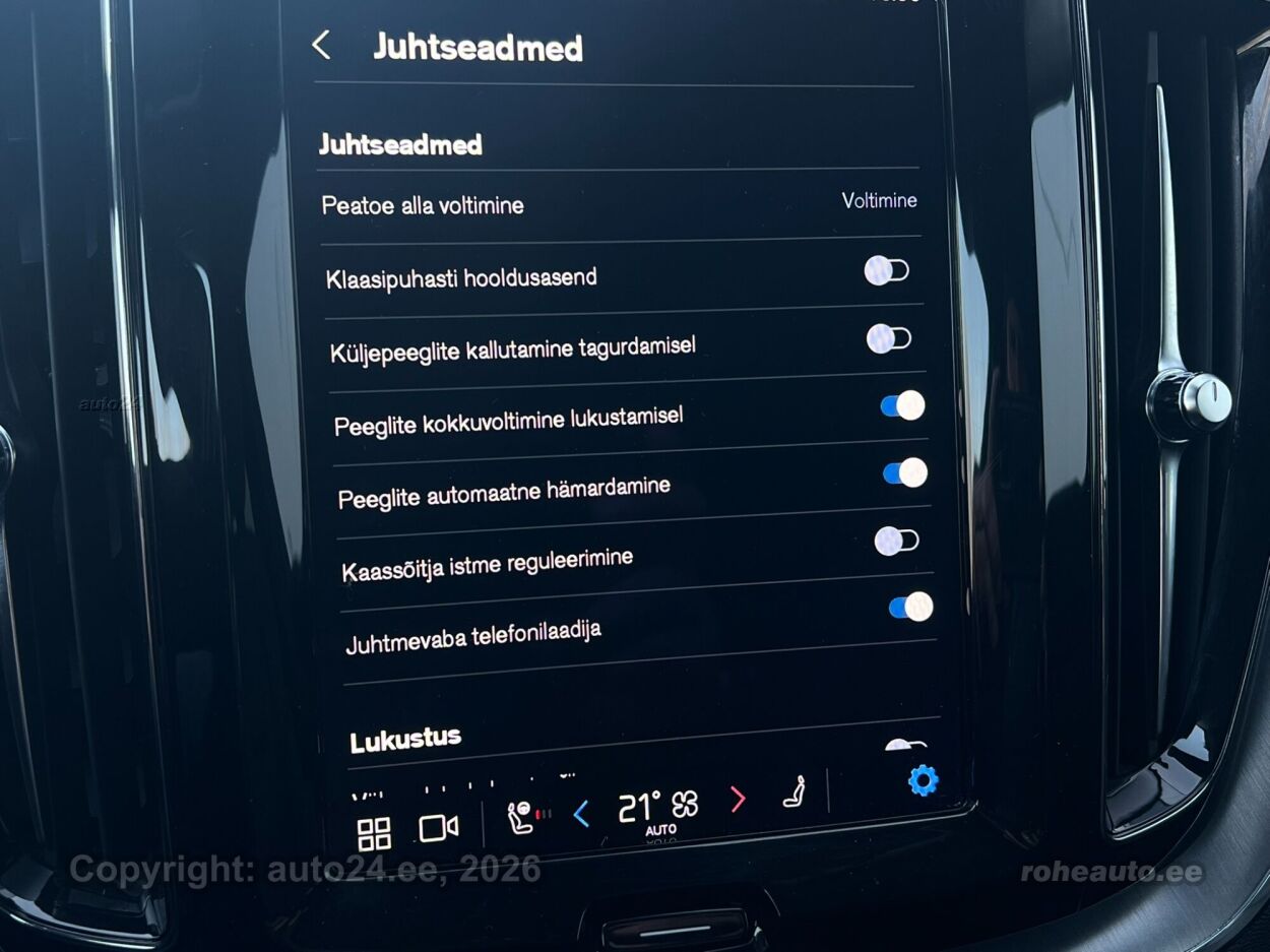 kliimaautomaatik, roolivõimendi (kiirustundlik), kesklukustus (puldiga), ABS pidurid, elektrooniline seisupidur, 5x turvapadi, turvakardinad, immobilisaator, lisapidurituli, stabiilsuskontroll, kokkupõrget ennetav pidurisüsteem, pidurdusjõukontroll, sõiduraja hoidmise abisüsteem, veojõukontroll, vihmasensor, ISOFIX lasteistme kinnitus (taga), kõrvalistuja turvapadja väljalülitamise võimalus, automaatne paigalseismise funktsioon / mägistardi abi, juhi väsimuse tuvastamise süsteem, udutuled (tagumine), LED (päevatuled, tagatuled, lähituled, kaugtuled), päevasõidutulede automaatne lülitus, kaugtulede ümberlülitamise assistent, suverehvid, valuveljed (18, Volvo), rehvirõhu kontrollsüsteem, reguleeritav roolisammas (kõrgus ja sügavus), multifunktsionaalne rool, nahkkattega rool, soojendusega rool, stereo (USB pesaga, originaal), Apple CarPlay, Android Auto, ekraan (ees), navigatsiooniseade (kaardiga), autokompuuter, käed vabad süsteem, topsihoidjad (ees, taga), nahkkattega käigukanginupp, nahkpolster, 2x elektriliselt reguleeritavad istmed (2x mäludega), istmed reguleeritava kõrgusega (juhiiste, kõrvalistuja iste), 4x istmesoojendused, reguleeritava kumerusega seljatugi (juhiiste, kõrvalistuja iste), käetugi ees (laekaga), käetugi taga (laekaga), tagaistme seljatugi allaklapitav, Comfort istmed, elektrilised välispeeglid (soojendusega, kokkuklapitavad, mäluga), 4x elektrilised akende tõstukid, toonitud klaasid, püsikiiruse hoidja (eessõitjaga distantsi hoidev), 2x peeglid päikesesirmides (valgustusega), VOLVO ON CALL + taimer / kalender mootori eelsoojendus, VOLVO ON CALL + taimer / kalender salongi eelsoojendus, salongi lisasoojendus, automaatselt tumenevad peeglid (sees, väljas), kohtvalgustid, parkimisandurid (ees, taga), parkimiskaamera (360), Coming-/Leaving-Home funktsioon, digitaalne näidikutepaneel, telefoni juhtmevaba laadimine, võtmeta avamine, võtmeta käivitus, start-stopp süsteem, 12v pistikupesad, reisiarvesti, pakiruumi avamine elektriliselt (jalaviipega, puldist), pagasikate, katusereelingud, kaubakinnituse konksud, veokonks (elektriline, teisaldatav), elektrilise soojendusega esiklaas, tagaklaasi soojendus, välistemperatuuri näidik, esi- ja tagarataste porikummid, tagaklaasi puhasti, VOLVO ON CALL - tasuta Volvo äpiga kasutamise võimalus ( eelsoojendus, kaugkäivitus jm. võimalused ), DAB raadio, "Google" kaartidel juhtimine |