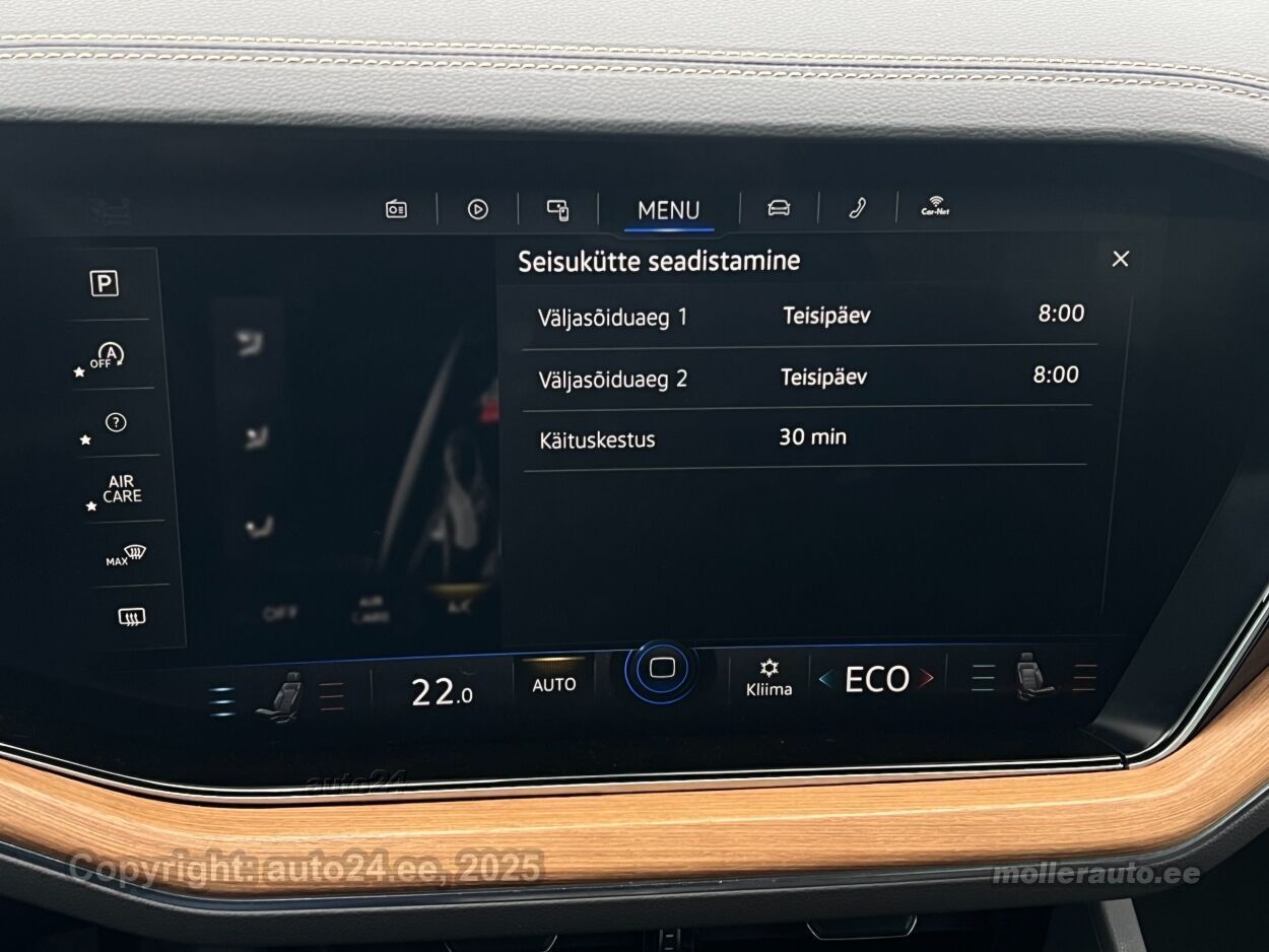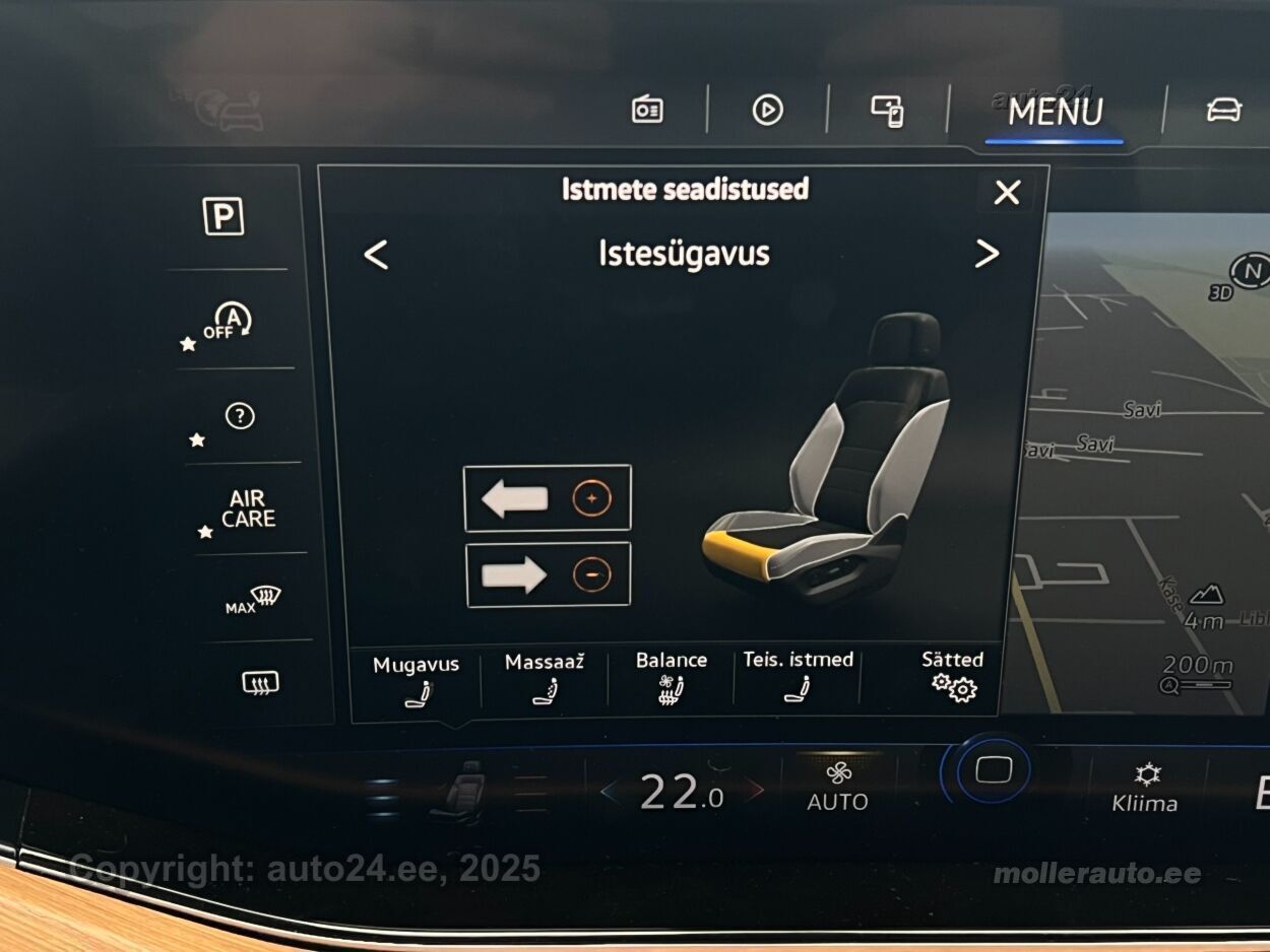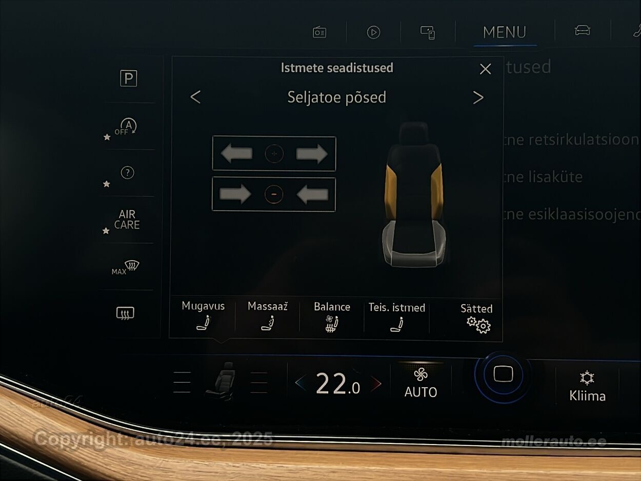 клима-автоматик, усилитель руля (чувствительный к скорости), центральный замок (с пультом), тормоза с АБС, 8x воздушная подушка, электронный стояночный тормоз, шторы безопасности, иммобилайзер, сигнализация (с датчиком наклона, с объемным датчиком), доп.стоп сигнал, система контроля стабильного положения, система предотвращения столкновения, система контроля тормозного усилия, система удержания полосы движения, ассистент смены полосы движения, система распознавания дорожных знаков, система контроля слепых зон, противобуксовочная система, датчик дождя, ISOFIX крепитель детских сидений (сзади), возможность выключит воздушную подушку переднего пассажира, автодержатель тормоза, система распознавания усталости водителя, светопакет, противотуманные фонари (передние, задний), омыватели передних фар, LED (фары дневного света, задние фары, ближнего света, дальнего света), автоматическое включение фар, ассистент переключения дальнего света, адаптивные фары поворота, зимняя резина (ламельная резина), литые диски (20, VW), система контроля давления в шинах, регулируемый руль (по высоте и глубине), многофункциональный руль, руль обшитый кожей, руль с отеплением, переключение скоростей с руля, DYNAUDIO стерео (оригинальное), усилитель звука, сабвуфер, Apple CarPlay, Android Auto, экран (спереди), система навигации (с картой), компьютер, система "hands free", GSM антенна, декоративные накладки в салоне (деревянный декор), карманы в спинках передних сидений, коврики (велюровые), коврик багажника, держатели стаканов (спереди, сзади), рукоятка переключения передач обшитая кожей, кожаная обивка, 2x электрически регулируемые сиденья, регулируемые по высоте сидения (водительское сидение, пассажирское сидение), 4x обогрев сидений, спинка с регулировкой выпуклости (водительское сидение, пассажирское сидение), массирующее сиденье (водителя, пассажира), вентилируемые сиденья (спереди), подлокотник спереди (с ящиком), подлокотник сзади (с ящиком), складывающаяся спинка заднего сиденья, Comfort сиденья, электрические зеркала заднего вида (с подогревом, складывающиеся, с памятью), 4x электрические стеклоподъемники, тонированные стекла, круиз контроль (с удержанием дистанции до переднего транспортного средство), 2x противосолнечные козырьки с зеркалами (с подсветкой), VOLKSWAGEN puldi ja taimeriga подогрев мотора, VOLKSWAGEN puldi ja taimeriga подогрев салона, дополнительный подогрев салона, отдельный кондиционер для задних сидений, встроенное устройство дистанционного открывания ворот, автоматически затемняемые зеркала (в салоне, внешние), местная подсветка, датчики парковки (спереди, сзади), функция автоматической парковки, парковочная камера, Coming-/Leaving-Home функция, цифровая приборная панель, беспроводная зарядка телефона, безключевой доступ, безключевой запуск, вспомогатели закрывания дверей, старт-стоп система, счетчик поездки, 12v электрические розетки, воздушная подкачка, регулируемое подвеска (электрически, жесткость, высота), электронное открывание багажника (движением ноги, с пульта), крышка багажного отделения (автоматический), прицепное устройство (электрический, съемное), крючки крепления багажа, система стабилизации прицепа, подогрев переднего стекла, подогрев заднего стекла, показатель температуры атмосферного воздуха, подогрев форсунок омывателя, комплект для ремонта шин, Lamineeritud ja IR valgust peegeldavad двойн