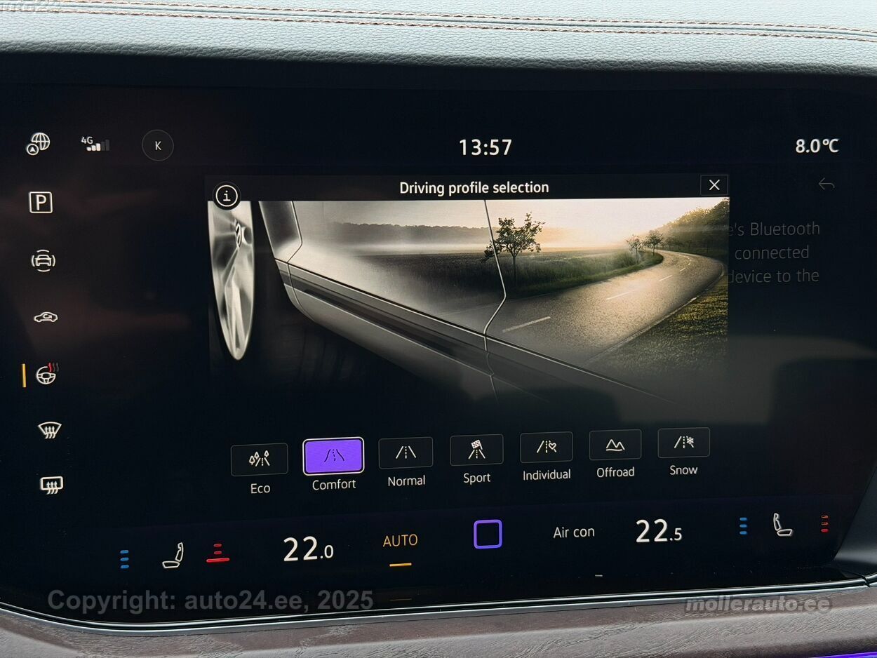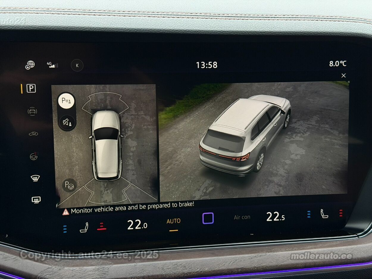клима-автоматик, усилитель руля (чувствительный к скорости), центральный замок (с пультом), тормоза с АБС, электронный стояночный тормоз, 4x воздушная подушка, шторы безопасности, иммобилайзер, сигнализация (с датчиком наклона, с объемным датчиком), доп.стоп сигнал, система контроля стабильного положения, система предотвращения столкновения, система контроля тормозного усилия, система удержания полосы движения, ассистент смены полосы движения, система распознавания дорожных знаков, система контроля слепых зон, противобуксовочная система, датчик дождя, ISOFIX крепитель детских сидений (сзади), автодержатель тормоза, возможность выключит воздушную подушку переднего пассажира, система распознавания усталости водителя, светопакет, противотуманные фонари (передние, задний, с функцией дополнительного освещения в поворотах), лазер, омыватели передних фар, LED (фары дневного света, задние фары, ближнего света, дальнего света), автоматическое включение фар, ассистент переключения дальнего света, адаптивные фары поворота, зимняя резина (ламельная резина), литые диски (21, VW "Napoli R21"), вместе с автомобилем впридачу (летняя резина), система контроля давления в шинах, регулируемый руль (по высоте и глубине), многофункциональный руль, руль обшитый кожей, руль с отеплением, переключение скоростей с руля, стерео (гнездо для USB, оригинальное), Apple CarPlay, Android Auto, экран (спереди), система навигации (с картой, управляемый голосом), компьютер, система "hands free", декоративные накладки в салоне, коврики, держатели стаканов (спереди, сзади), рукоятка переключения передач обшитая кожей, тёмная обшивка потолка, "Varenna" ergoComfort кожаная обивка, 2x электрически регулируемые сиденья (2x с памятью), регулируемые по высоте сидения (водительское сидение, пассажирское сидение), спинка с регулировкой выпуклости (водительское сидение, пассажирское сидение), 2x обогрев сидений, вентилируемые сиденья (спереди), подлокотник спереди (с ящиком), подлокотник сзади, складывающаяся спинка заднего сиденья, Comfort сиденья, электрические зеркала заднего вида (с подогревом, складывающиеся, с памятью), 4x электрические стеклоподъемники, тонированные стекла, круиз контроль (с удержанием дистанции до переднего транспортного средство), 2x противосолнечные козырьки с зеркалами (с подсветкой), VW puldi, taimeri või äpist подогрев мотора, VW puldi, taimeri või äpist подогрев салона, дополнительный подогрев салона, автоматически затемняемые зеркала (в салоне, внешние), встроенное освещение в дверях, местная подсветка, датчики парковки (спереди, сзади), функция автоматической парковки, парковочная камера (360), Coming-/Leaving-Home функция, цифровая приборная панель, безключевой доступ, безключевой запуск, вспомогатели закрывания дверей, старт-стоп система, воздушная подкачка, регулируемое подвеска (электрически, жесткость, высота), электронное открывание багажника (движением ноги, с пульта), крышка багажного отделения (автоматический), дуги на крыше, крючки крепления багажа, прицепное устройство (электрический, съемное), система стабилизации прицепа, подогрев заднего стекла, показатель температуры атмосферного воздуха, двойные стекла, очиститель заднего стекла, PSL Adaptiivne õhkvedrustus, WB3 Mälupakett Premium, WLD Varenna nahast ergoComfort istmed, VW5 Lamineeritud turvaklaasiga külje- ja tagaaknad, toonitud tagumised külgmised