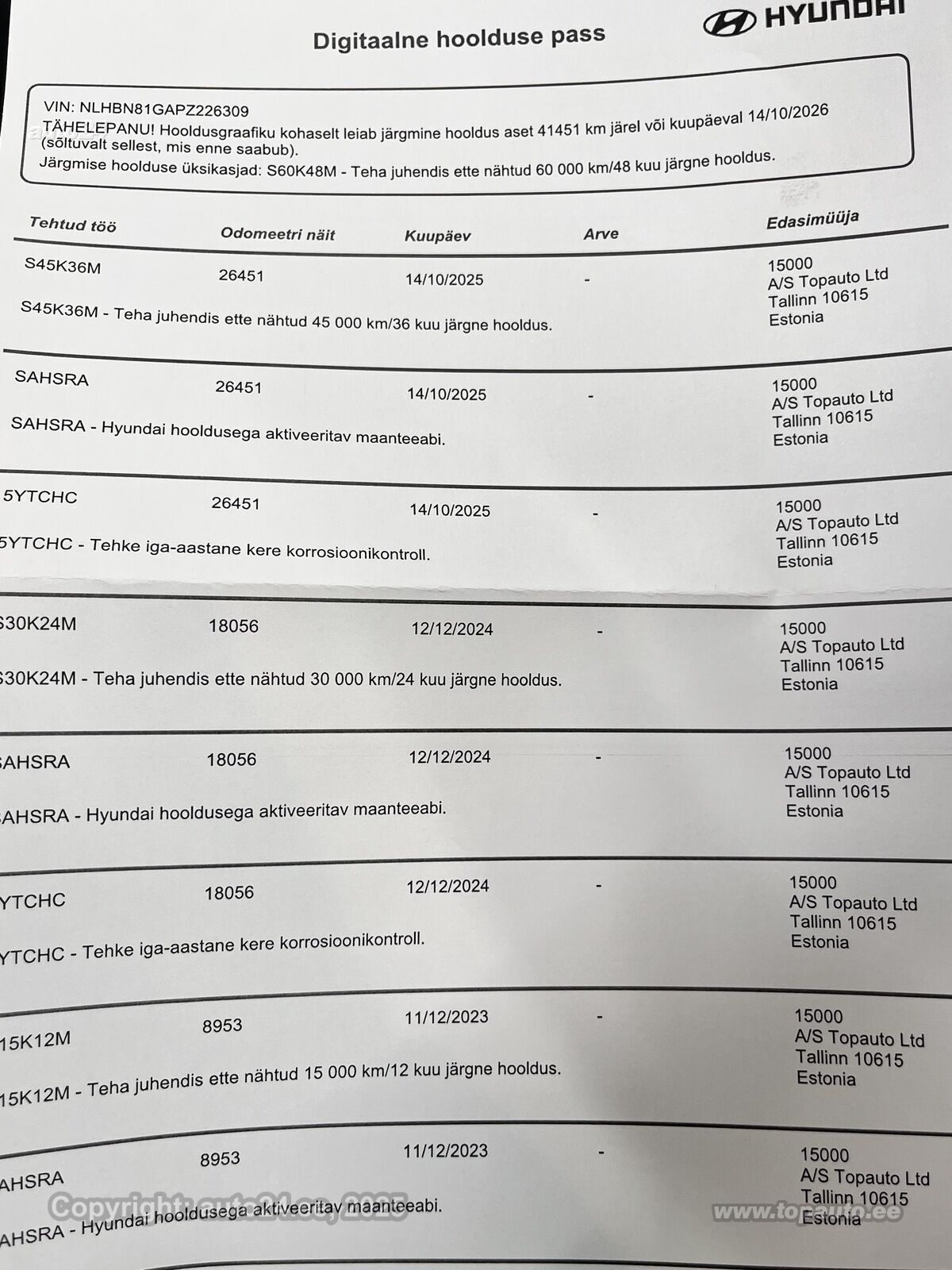 - Viimane hooldus 10.2025 läbisõidul 26 451 kilomeetrit