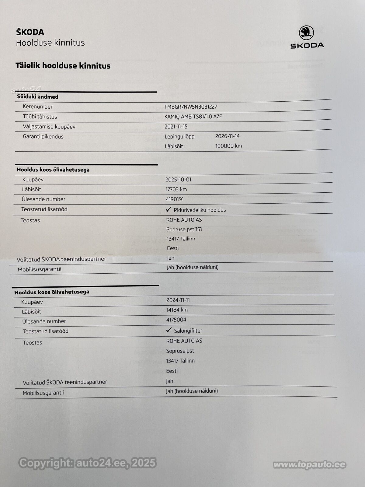 - Viimane hooldus 01.10.2025 läbisõidul 17 703 kilomeetrit Rohe Auto