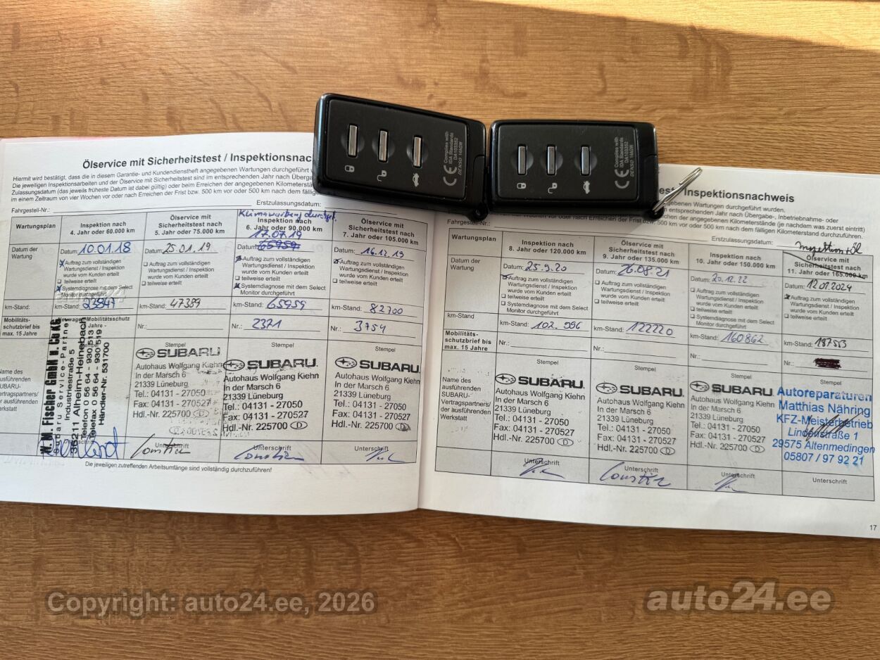 kliimaautomaatik, roolivõimendi, kesklukustus (puldiga), ABS pidurid, 8x turvapadi, elektrooniline seisupidur, lisapidurituli, stabiilsuskontroll, pidurdusjõukontroll, veojõukontroll, turvavööde eelpingutid esiistmetel, vihmasensor, ISOFIX lasteistme kinnitus (taga), udutuled (eesmised, tagumine), Xenon (lähituled), esitulede pesurid, M+S talverehvid (lamellrehvid), valuveljed (16, SUBARU), reguleeritav roolisammas (kõrgus ja sügavus), multifunktsionaalne rool, nahkkattega rool, käiguvahetus roolilt, stereo (CD, MP3, USB pesaga, originaal), kõlarid, ekraan (ees), navigatsiooniseade (kaardiga), autokompuuter, käed vabad süsteem, iluliistud salongis, taskud esiistmete seljatugedes, jalamatid (kummist), topsihoidjad (ees, taga), nahkpolster, elektriliselt reguleeritavad istmed (1x mäludega), istmed reguleeritava kõrgusega (juhiiste), 2x istmesoojendused, käetugi ees (laekaga), käetugi taga, tagaistme seljatugi allaklapitav, elektrilised välispeeglid (soojendusega, kokkuklapitavad), 4x elektrilised akende tõstukid, katuseluuk (klaasist, elektriline), püsikiiruse hoidja, 2x peeglid päikesesirmides (valgustusega), kohtvalgustid, tagavararatas, võtmeta avamine, võtmeta käivitus, 12v pistikupesad, pagasikate, tagaklaasi soojendus, välistemperatuuri näidik, tagaklaasi puhasti |