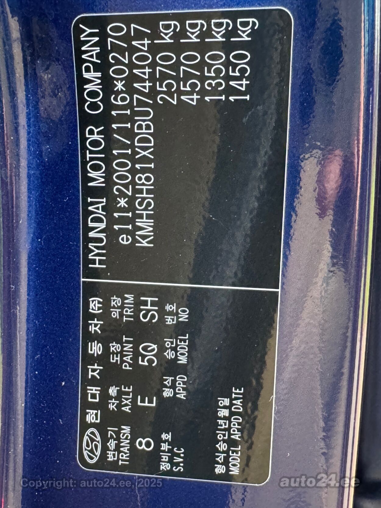 kliimaautomaatik, roolivõimendi, kesklukustus (puldiga), ABS pidurid, 10x turvapadi, 5x peatoed (esiistmetel, tagaistmetel), lisapidurituli, stabiilsuskontroll, pidurdusjõukontroll, ESP veojõukontroll, turvavööde eelpingutid esiistmetel, vihmasensor, ISOFIX lasteistme kinnitus (taga), kõrvalistuja turvapadja väljalülitamise võimalus, udutuled (eesmised, tagumine), Xenon (lähituled), esitulede pesurid, M+S talverehvid (lamellrehvid), valuveljed (18, HYUNDAI), rehvirõhu kontrollsüsteem, reguleeritav roolisammas (kõrgus ja sügavus), multifunktsionaalne rool, nahkkattega rool, stereo (CD, MP3, USB pesaga, originaal), kõlarid, navigatsiooniseade (kaardiga), autokompuuter, käed vabad süsteem, iluliistud salongis, taskud esiistmete seljatugedes, jalamatid (kummist), topsihoidjad (ees, taga), nahkpolster, 2x elektriliselt reguleeritavad istmed, istmed reguleeritava kõrgusega (kõrvalistuja iste, juhiiste), reguleeritava kumerusega seljatugi (juhiiste), 2x istmesoojendused, elektrilised välispeeglid (soojendusega, kokkuklapitavad), 4x elektrilised akende tõstukid, toonitud klaasid, püsikiiruse hoidja, 2x peeglid päikesesirmides (valgustusega), automaatselt tumenevad peeglid (sees), kohtvalgustid, parkimisandurid (ees, taga), parkimiskaamera, tagavararatas, võtmeta avamine, võtmeta käivitus, 12v pistikupesad, pagasikate, katusereelingud, veokonks, elektrilise soojendusega esiklaas, tagaklaasi soojendus, välistemperatuuri näidik, tagaklaasi puhasti, NAHKSISU, KEYLESS, PARKIMISKAAMERA, 2 VÕTIT |