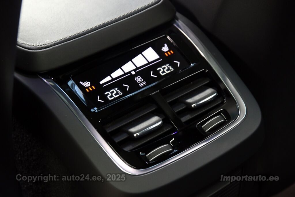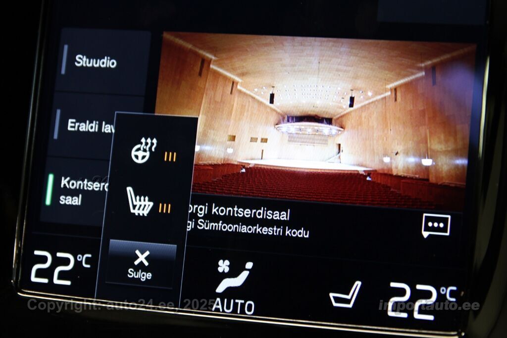 клима-автоматик, Collision Warning / City Safety II система автоматического торможения, усилитель руля (чувствительный к скорости), центральный замок (с пультом), тормоза с АБС, электронный стояночный тормоз, 10x воздушная подушка, шторы безопасности, подголовники (на передних сиденьях, на задних сиденьях), иммобилайзер, доп.стоп сигнал, DSTC система контроля стабильного положения, Collision Warning / City Safety II система предотвращения столкновения, EBA система контроля тормозного усилия, Pilot Assist / Lane Keeping Aid система удержания полосы движения, ассистент смены полосы движения, система распознавания дорожных знаков, система контроля слепых зон, DSTC противобуксовочная система, натяжители ремней безопасности спереди, датчик дождя, ISOFIX крепитель детских сидений (сзади), автодержатель тормоза, возможность выключит воздушную подушку переднего пассажира, система распознавания усталости водителя, светопакет, противотуманные фонари (передние, задний, с функцией дополнительного освещения в поворотах), LED (фары дневного света, задние фары, ближнего света, дальнего света), омыватели передних фар, автоматическое включение фар, ассистент переключения дальнего света, адаптивные фары поворота, летняя резина, литые диски (21", 8-Spoke Diamond Cut), система контроля давления в шинах, регулируемый руль (по высоте и глубине), многофункциональный руль, руль обшитый кожей, руль с отеплением, Bowers & Wilkins Premium Sound Multimedia стерео (MP3, гнездо для USB, оригинальное), усилитель звука, звуковые колонки, сабвуфер, Apple CarPlay, Android Auto, Sensus Navi- ja multimeediasüsteem + 360k panoraamkaamera экран (спереди), система навигации (с картой, управляемый голосом), компьютер, Volvo Bluetooth система "hands free", декоративные накладки в салоне, карманы в спинках передних сидений, коврики (текстильные), держатели стаканов, рукоятка переключения передач обшитая кожей, тёмная обшивка потолка, Sportseats Agnes Nappa Charcoal кожаная обивка, 2x электрически регулируемые сиденья (2x с памятью), регулируемые по высоте сидения (водительское сидение, пассажирское сидение), спинка с регулировкой выпуклости (водительское сидение, пассажирское сидение), 4x обогрев сидений, подлокотник спереди (с ящиком), подлокотник сзади (с ящиком), складывающаяся спинка заднего сиденья, электрические зеркала заднего вида (с подогревом, складывающиеся, с памятью), 4x электрические стеклоподъемники, тонированные стекла, panoraam люк на крыше (из стекла, электрический), круиз контроль (с удержанием дистанции до переднего транспортного средство), панорамная крыша, 2x противосолнечные козырьки с зеркалами (с подсветкой), 2x гардина типа руло на дверях, Tehase Webasto подогрев мотора, подогрев салона, отдельный кондиционер для задних сидений, автоматически затемняемые зеркала (в салоне, внешние), встроенное освещение в дверях, местная подсветка, датчики парковки (спереди, сзади), парковочная камера (360), Coming-/Leaving-Home функция, цифровая приборная панель, проекционный дисплей, задний спойлер, безключевой доступ, безключевой запуск, старт-стоп система, 12v электрические розетки, счетчик поездки, воздушная подкачка, регулируемое подвеска (жесткость, высота), электронное открывание багажника (движением ноги, с пульта), крышка багажного отделения, дуги на крыше, разделительная сетка салона и багажного отделения, подогрев заднего стекла, показатель температуры атмосферного воздуха, подогрев форсунок омывателя, lamineeritud двойные стекла
