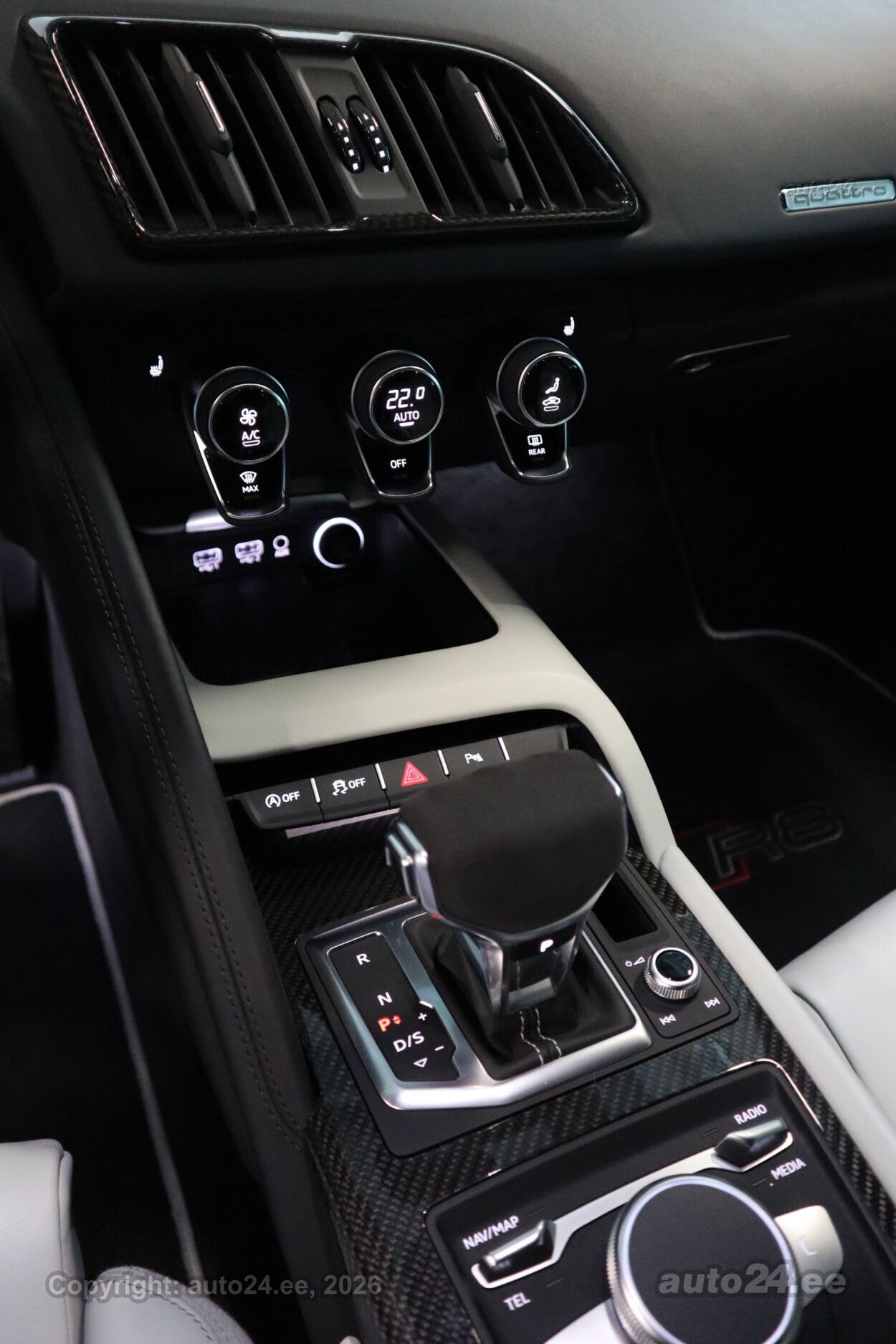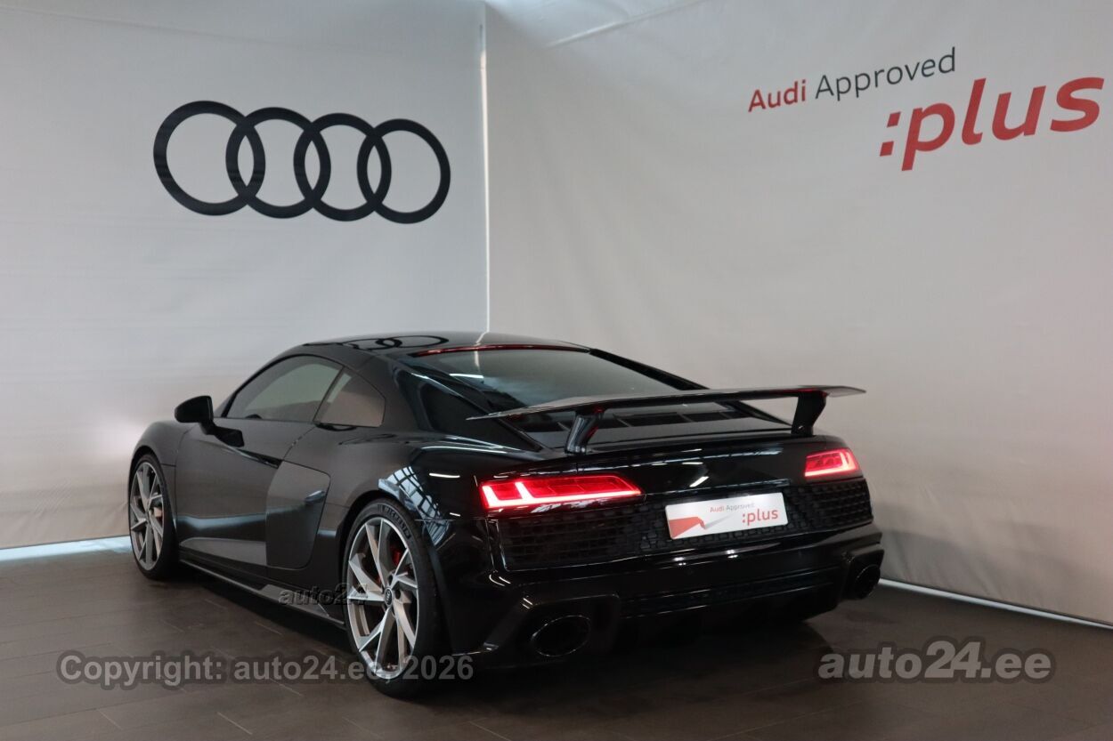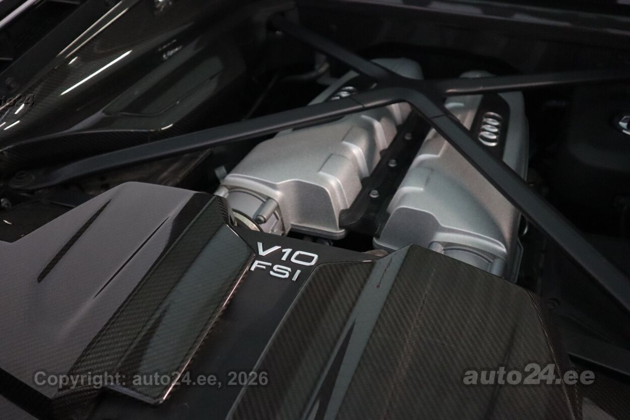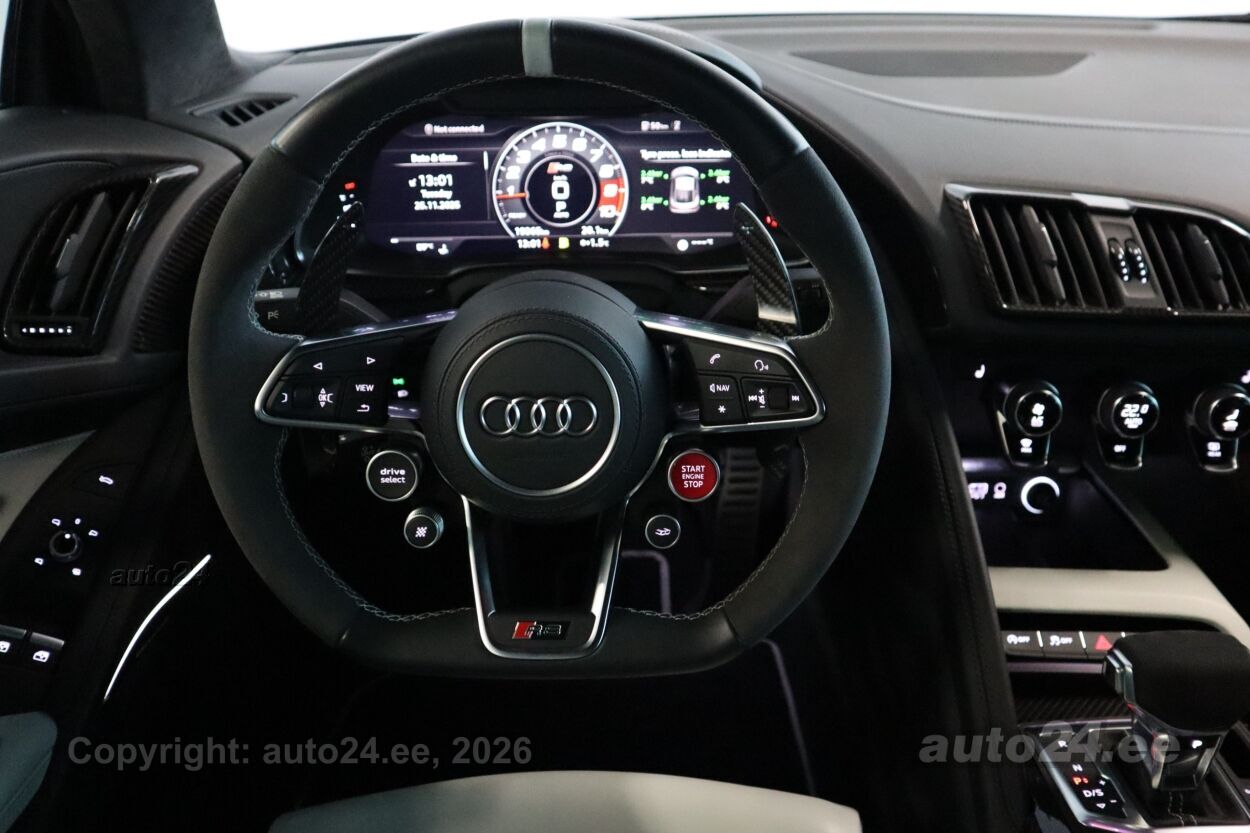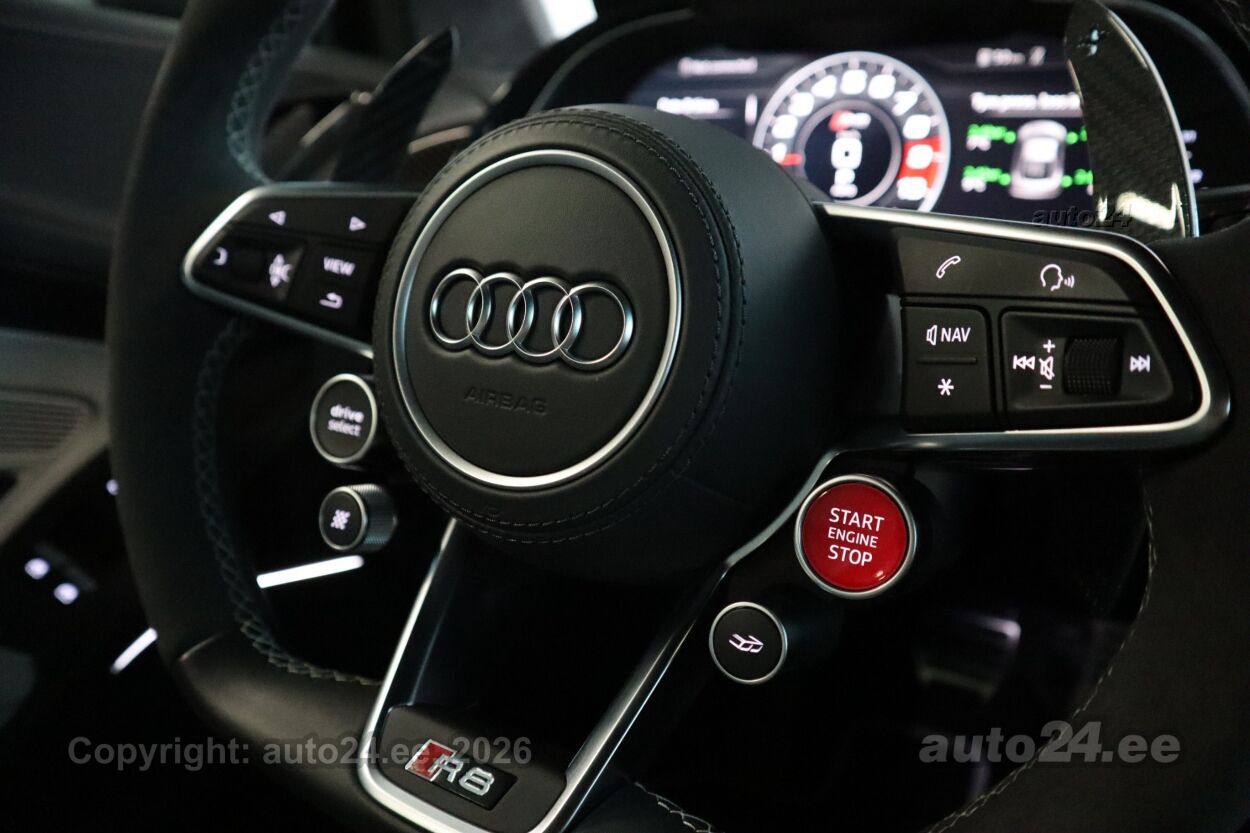 reguleeritav vedrustus (elektriliselt, jäikus), 12v pistikupesad, välistemperatuuri näidik, tagaklaasi soojendus, reisiarvesti, Dekoorliistud laiendatud ("Audi virtual cockpit'il ja õhutusavades) - kõrgläikega "Carbon", Dekoorliistud salongis - carbon (läikiv) ustel ja keskkonsoolil, Esilaternad - LED-tehnoloogia põhised esilaternad kombineeritud "Audi Laser lights" tehnoloogiaga, sh dünaamilised suunatuled esilaternates ja kaugtulede assistent, Istmete elektriline reguleerimine, sh pneumaatiliselt reguleeritav nimmetugi ja küljetoed, mälufunktsiooniga, "Audi exclusive" jalamatid "R8" logoga, Kaitseraua detailid (ees spoiler ja taga difuusor) "Audi exclusive carbon"-optikaga, Kõlarisüsteem - "Bang & Olufsen Sound System" (13 kõlarit, koguväljundvõimsusega 550W), Kütusepaak suurendatud mahutavusega - ca 83 liitrit, Laepolster "Alcantara" koos "diamond"-õmblustega, Laiendatud nahapakett - armatuurlaud, uste sisepinnad, istmepoolsed ukse lävekattepinnad, tagasein, turvapadja kate roolil, keskkonsool kaetud "Fine Nappa" nahkpolstriga, Lävekatteliistud valgustusega - läikiv "Carbon", Meedialiides "Audi Smartphone Interface", Mootoriruum dekoreeritud läikiva "Carbon"-optikaga, Panipaigapakett - võrgud esiistmete taga ja külgmised võrgud pagasiruumis, Parkimiskaamera auto tagaosas, Välispeeglid automaatselt tumenevad ja elektriliselt kokkuklapitavad, Välispeeglite korpused "Audi exclusive - Carbon", Pidurisadulad värvitud kõrgläike punaseks, Püsikiirushoidja - "Cruise control", Roolitundlikkuse seadistuse võimalus - "Dynamic steering", Telefon ja kommunikatsioon - "Audi connect", Telefon ja kommunikatsioon - "Audi phone box" koos LTE-toega, universaalne telefonialus käetoes esiistmete vahel võimaldamaks telefonikõnesid läbi "Bluetooth" ühenduse, Valgustuspakett - täiendav valgustus ustes, keskkonsoolis, jalgaderuumis ja mootoriruumis, Vedrustus - "Audi magnetic ride + CFRP", sh lisa stabilisaatorvardad (jäigem vedrustus) - kolm erinevat vedrustuseseadistuse võimalust: auto/comfort/dynamic, Pikendatud tehasegarantii - 5 aastat (2 aastat + 3 aastat lisagarantiid), läbisõiduni 100 000 km